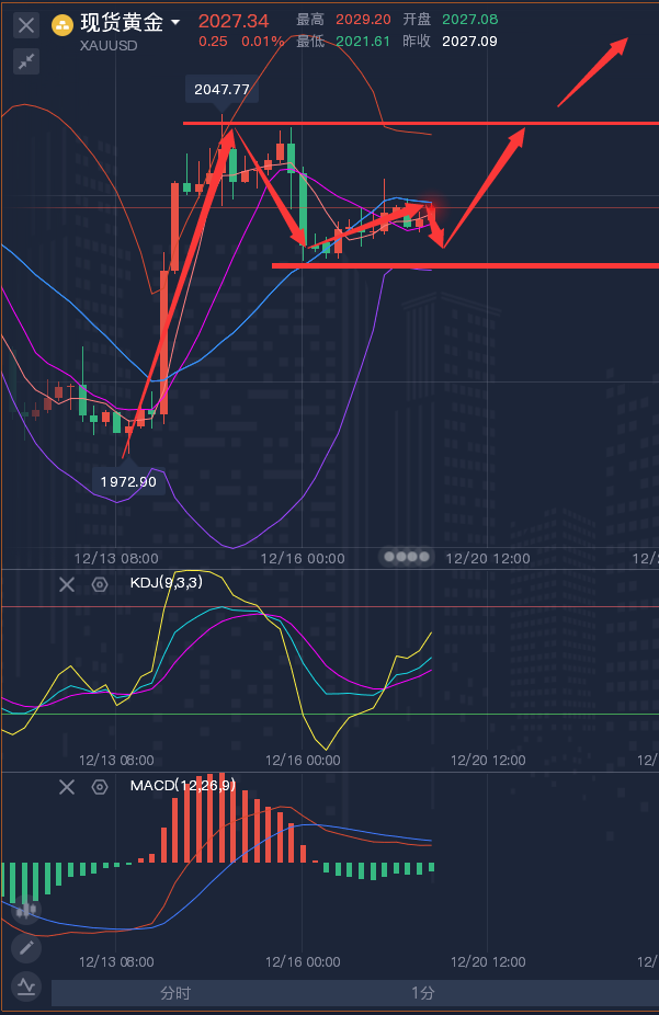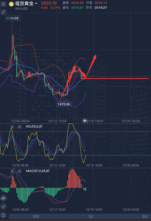 实力是盈利的基础,稳健是获利的根本!大家好,我依然是活跃在投资一线的黄金分析师龚关铭。市场千变万化,交易机会稍纵即逝,没有一成不变的趋势,面对盘整行情,呆若木鸡的操作手法会让你的仓位快速缩水,来回被打脸,只有提前预知市场命脉才能如鱼得水。 ————————消息面 周二(12月19日)黄金价格交投于2024美元/盎司附近,本周一系列美国经济数据将要公布,包括周五公布的11月份核心个人消费支出(PCE)物价指数报告。分析师预测,美国11月核心PCE较前月上升0.2%,较上年同期升幅将降至2021年中期以来的最低点3.4%。在周一公布的美国12月NAHB房产市场指数录得37,高于市场预期36,前值