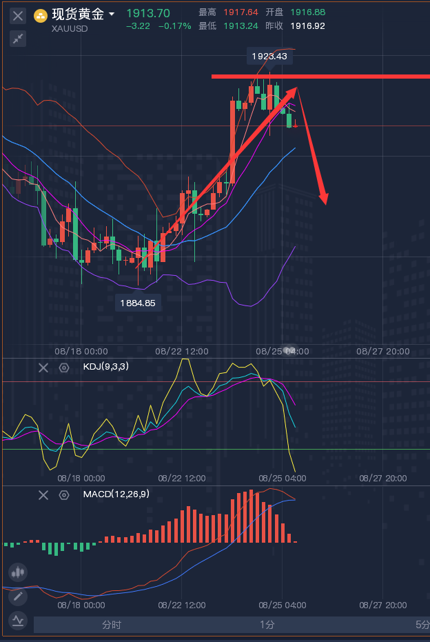 能带你盈利的才叫老师,能互相扶持,互帮互助的才是朋友,嘘寒问暖的是亲人,骗吃骗喝的是表面兄弟,投资交易如同做人,选择大于努力,不论是交易方向的选择,投资方法的选择,还是老师的选择都至关重要,不能带你盈利的都是夸夸其谈,谋事在天,成事在人,诚恳走一生,虚情假意将永远被唾弃,是金子总会发光,鱼龙混杂的市场,吹嘘得来的认可,总会原形毕露,唯有坚持写出对投资者有用的分析,能让投资者少走点弯路,学到技巧与知识,少错一单,那么我相信日久见人心。 ————————消息面 周五(8月25日)现货黄金窄幅震荡,目前交投于1916.76美元/盎司附近,隔夜出炉的美国初请失业金人数连续第二周下降,市场预计美联储可