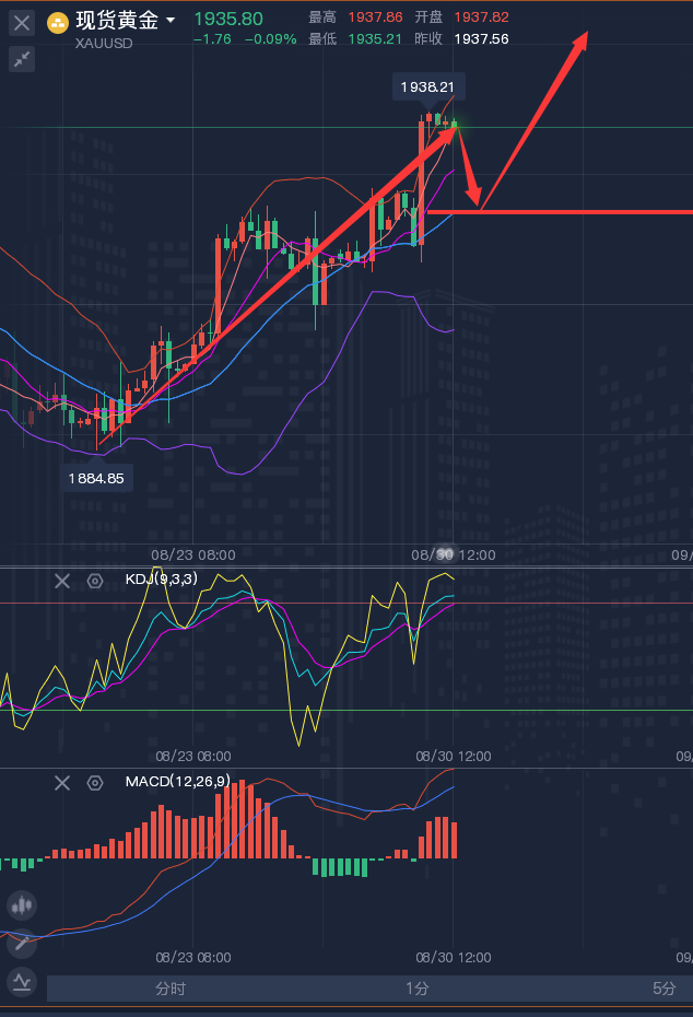 投资是一个长期的过程,我希望我们一起做的是有策略的投资,而不是盲目的投机。买卖点位不应该是随意进场,请对自己的资金负责,永远记住一句话,专业的人做专业的事,一切实战只为盈利,合作只为双赢。经常做错方向和进出场点位把控的不是很好,操作中亏损的朋友,可与龚关铭一起交流。 ————————消息面 周三(8月30日)现货黄金窄幅震荡,目前交投于1936.12美元/盎司,隔夜美国职位空缺数据表现弱于市场预期,市场强化了美联储9月份维持当前利率不变的预期,并降低了年内再次加息的预期,帮助金价升至近三周高位,技术面看涨信号有所增强。如果有更多数据显示美国就业市场放缓,将有望给金价进一步上涨提供机会。 原油