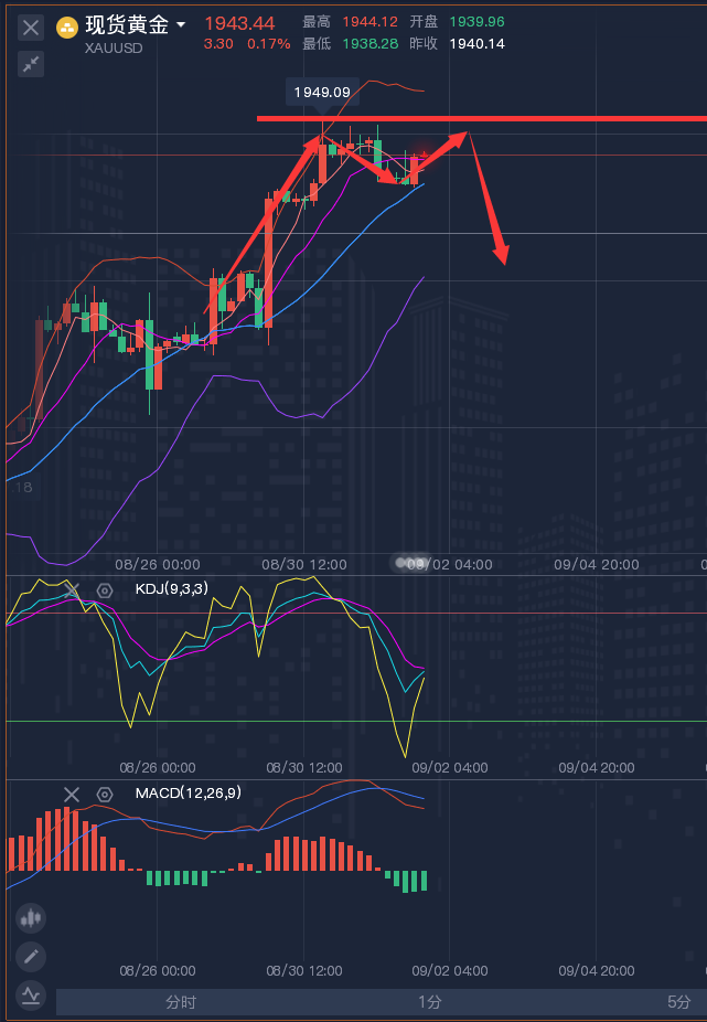 当你的才华还撑不起你的野心时,那就要静下心来学习,当你的能力还驾驭不了你的目标时,那就应该沉下来历练,只有通过学习、交易、总结,你才会明白,其实自己真的不是不被市场接纳,只是以前不愿意改变而已,投资有两种,一种生理性投资,是为了解决温饱,另一种,属于精神投资,是实现人生的价值,是与人性的贪婪和恐惧进行博弈和赛跑。 ————————消息面 9月1日,美元指数窄幅震荡,目前交投于103.65附近。现货黄金震荡微涨,金价目前交投在1943美元/盎司左右。原油再度强势上行,价格向上逼近8月10日以来的近期高点,主要是受到了昨日俄罗斯有关延续减产策略消息的影响。 投资者将迎来备受瞩目的美国非农就业报告