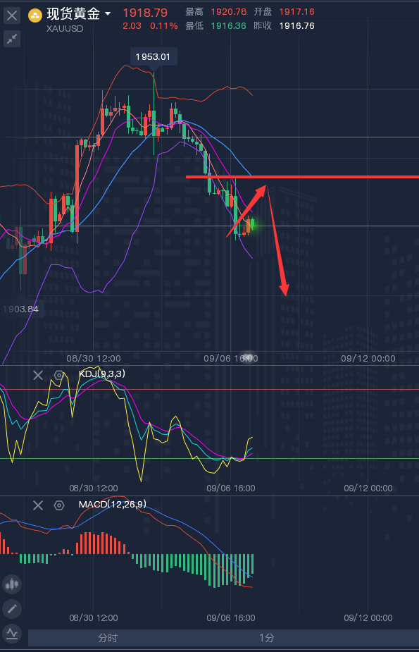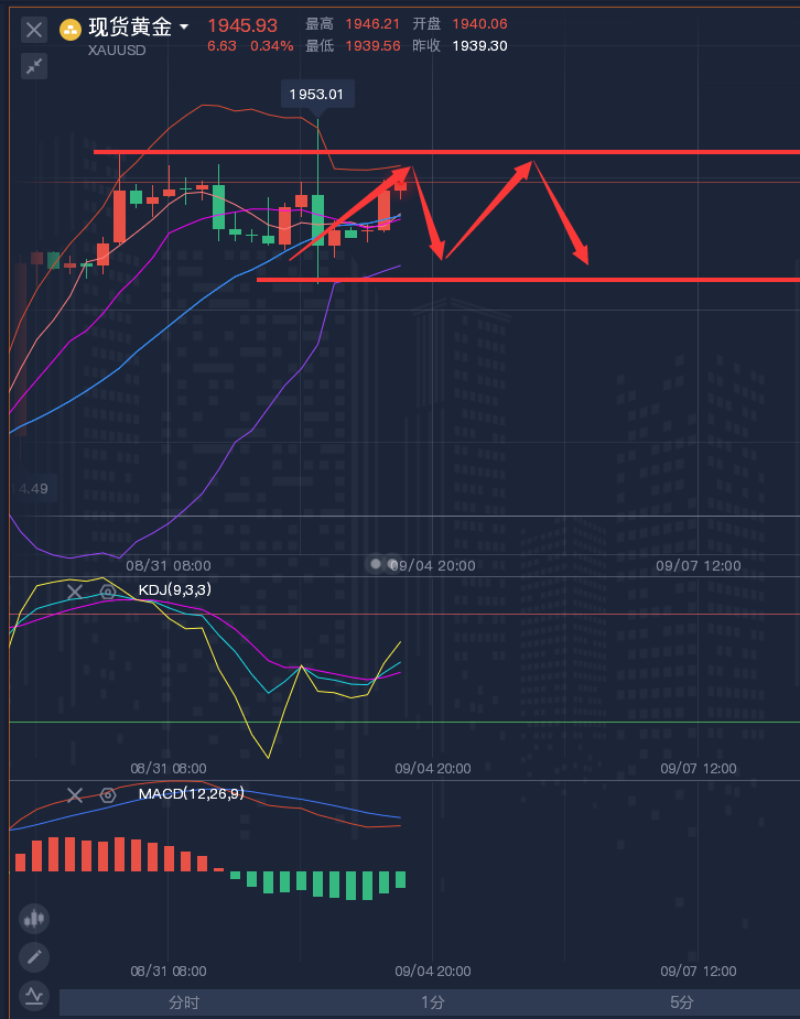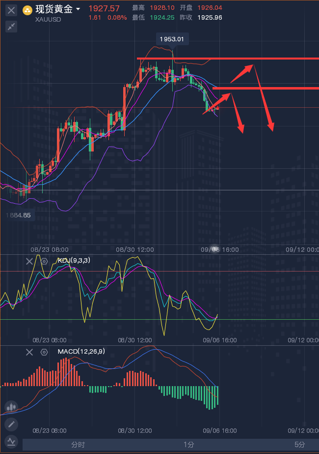 一个人能走多远,要看他有谁同行;一个人有多优秀,要看他有谁指点;一个人有多成功,要看他有谁相伴。时势造英雄很容易。英雄造时势就很难。如果你还在投资市场里亏损,或者还在为找不到一个有实力和责任的老师而发愁,可以看分析,验实力,肯定实力和服务后一些合作水到渠成! ————————消息面 周三(9月6日),黄金原油窄幅震荡,在本月关键经济数据和美联储利率决定公布之前,少数公司向市场出售数万亿美元的债券,导致美国国债下跌。由于石油价格上涨加剧了人们对通胀的担忧,美国股市下跌,美元触及三月份以来的最高水平。美国债券受到冲击,10年期国债收益率接近4.3%。 ————————黄金走势分析及策略 黄金昨日