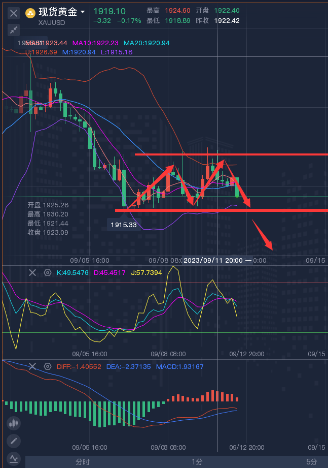 交易的关键在于掌握合适的节奏,包括行情的步骤和节奏。一旦节奏乱了,步骤错了,一切都会出错。行情本身并不复杂,复杂的是人心和情绪的影响。投资者需要保持冷静,不要被市场的复杂性和波动性所影响。行情的涨跌和消息的利好利空本质上是相同的,主力控盘也只是通过诱多或诱空来影响市场。因此,投资者需要把握市场运行的本质规律,不要被表象所迷惑。 ————————消息面 黄金消息面解析:周二(9月12日)现货黄金维持震荡,目前交投于1920美元附近。隔日现货黄金先涨后跌,其盘中多次上测1930关口未果,而后在美盘时段回吐部分涨幅,最终小幅收涨,美元指数创下近两周以来最大单日跌幅,美元的任何短期走势也有可能因周三