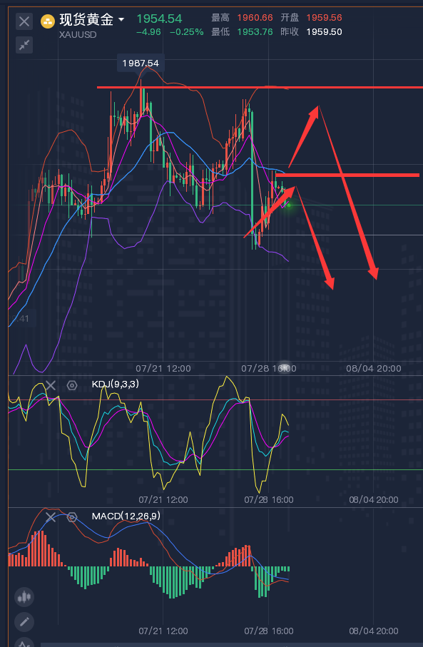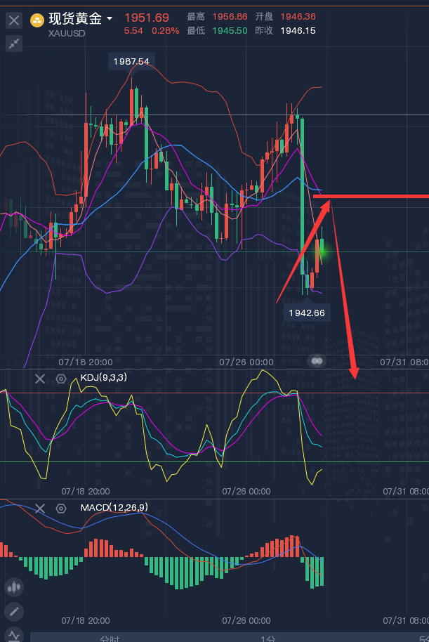 方向对了不怕路远,用时间见证实力,用实力赢得未来,让信任成为利润,用利润解除疑惑。市场瞬息万变,顺势而为,才是王道,趋势来了就是干,不要逆势抄底,免得难受煎熬。交易切记不要意气用事,市场专治各种不服,所以一定不要扛单,相信很多人都深有体会,越抗越慌,浮亏不断放大,搞的吃不好睡不好,还白白错过很多机会,如果你也有这些烦恼,那不妨跟上龚关铭的节奏来试试,看能否找到您的治愈良药! ————————消息面 周五(7月28日)现货黄金震荡微涨,目前交投于1951美元/盎司附近,隔夜金价大跌后,吸引了一些逢低买盘支撑金价。因为美国二季度GDP数据强于市场预期,劳动力市场也韧性十足,帮助美元指数周四录得近
