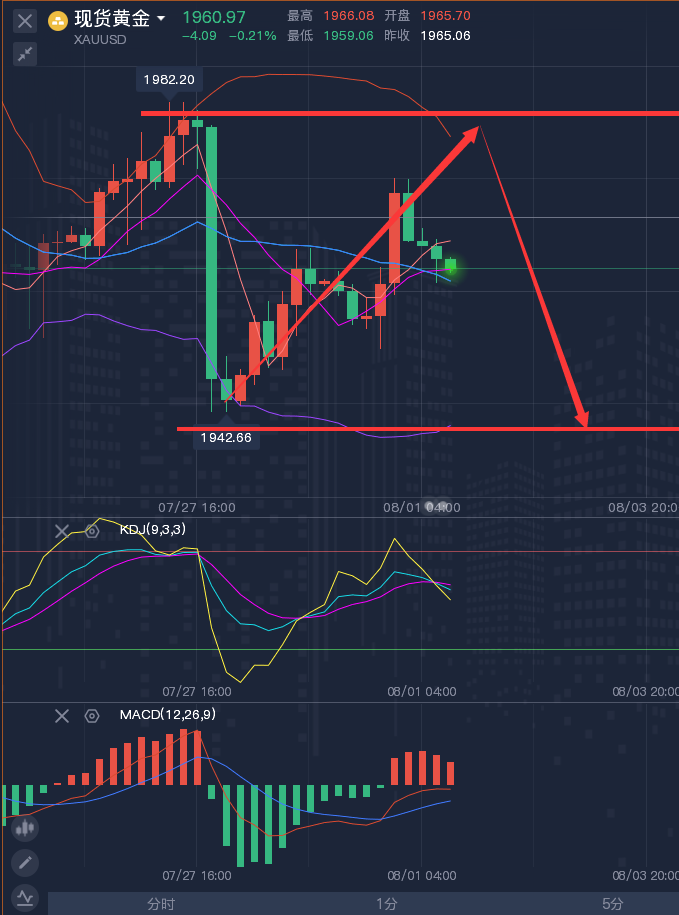不管是昨天的市场、今天的市场、还是明天市场;观望者继续观望,担心者继续担心,害怕继续害怕,赚钱者继续赚钱;任何现状都是在考验我们的心理素质,任何市场也都是在遵循自然法则;适者生存优胜劣汰,一想二干三成功,一等二看三落空;想是问题,做是答案;输在犹豫,赢在行动! ————————消息面 周四(7月27日)现货黄金小幅冲高,一度创近一周新高至1981.91美元/盎司,隔夜美联储如期加息25个基点后,美联储主席鲍威尔讲话并不特别鹰派,市场普遍预计美联储接近加息周期尾声,美元和美债收益率下跌,给金价提供支撑。技术面来看,短线看涨信号有所增加,若能顶破上周高点1987附近阻力,则有望进一步向2000关