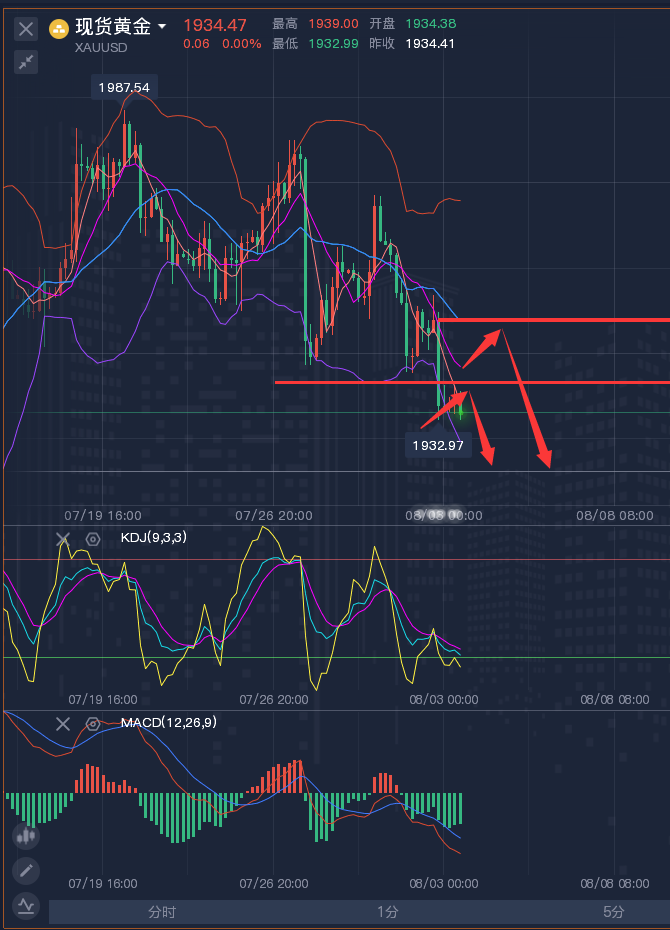 我一直相信选择比努力更重要,一个好的指导老师,一个好的技术团队除了给客户带来盈利以外,更应该对客户负责任。个人投资者,凭一己之力面对市场,很容易出现当局者迷的情况,遇见暴涨暴跌而措手不及,而如果能够有一个人在圈外看清楚情形,给出方向,就可以做的更好。如果你做单不顺或投资经常资金缩水,那么可以跟龚关铭聊聊,我尽己所能授之以渔。 ————————消息面 周五(8月4日)现货黄金在近三周低位窄幅震荡,目前交投于1935.60美元/盎司附近,隔夜美国经济数据基本符合预期,多数投资者等待美国7月份非农就业报告的出炉。不过,市场普遍对美国就业市场持乐观预期,这帮助美债收益率继续冲高,10年期国债收益率刷