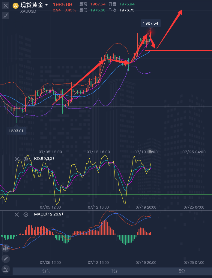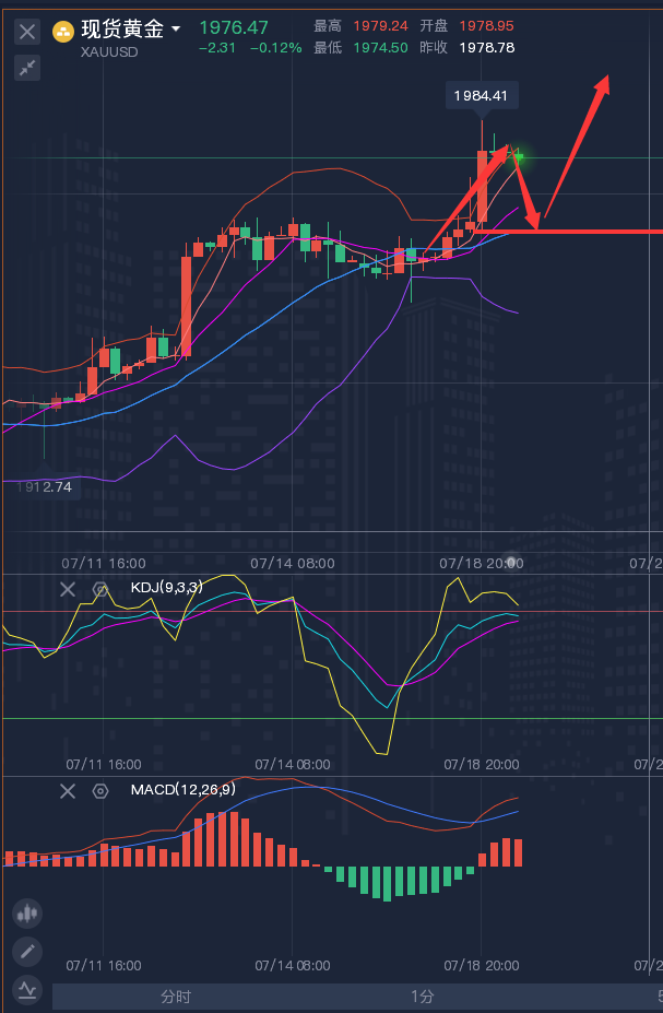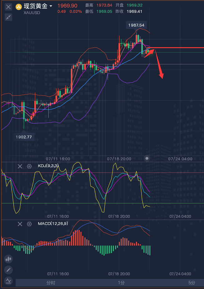 交易如同攀爬,只有登上绝顶,才能享受奇观胜景;若遇难而退,中途放弃,只会于机会擦肩而过,在交易中,最重要的就是要敢于出手,面对机会,果断出击,这样才不至于错失机会,追悔莫及。彩虹总在风雨后,人面对的最强大的敌人是自己,很多时候是迷失在自我设置的障碍里无法自拔,突破自我,才能掌控人生。正确分析失败的原因,及时补救,方能扭亏为盈。磨练心智,提高交易技巧,磨刀不误砍柴工,没时间学习,就没有机会成功。 ————————消息面 周三(7月19日)现货黄金震荡微跌,目前交投于1974.90美元/盎司附近,因隔夜美股大涨打压避险情绪,但金价仍守住了隔夜大部分涨幅。周二金价强势上涨近30美元,顶破了多重阻力