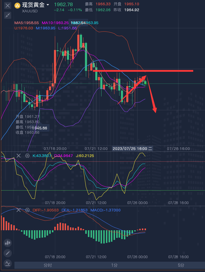 活鱼会逆流而上,死鱼才会随波逐流!而交易当中永远是盈利者顺势而为,亏损者逆势而动!这就是一个剪羊毛的游戏,如果你不是剪羊毛的,很明显就是被剪的,这个市场没有怜悯,永远是胜者为王!你一直在关注,一直在考验,却未曾想过多少赚钱的机会你已经失去。每天都有很多投资朋友找到我,考察一下我的实力,每天看看问问操作建议,然后自己依旧深陷亏损的泥潭!每日发文章,不敢说是常胜不败,但至少观点明确,策略公开!实力大家共同验证,但赚钱只在一小部分人,二八定律! ————————消息面 周一(7月24日)现货黄金窄幅震荡,目前交投于1961.20美元/盎司附近;上周五金价下跌,为日线连续三个交易日下跌,因美国就业数