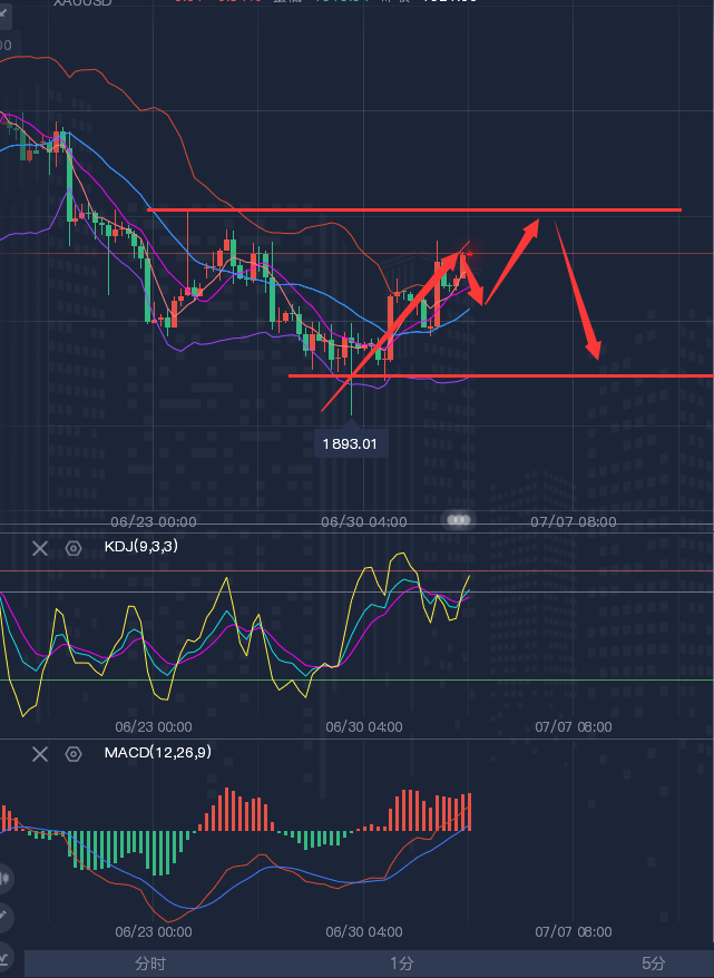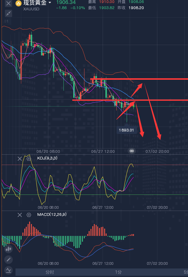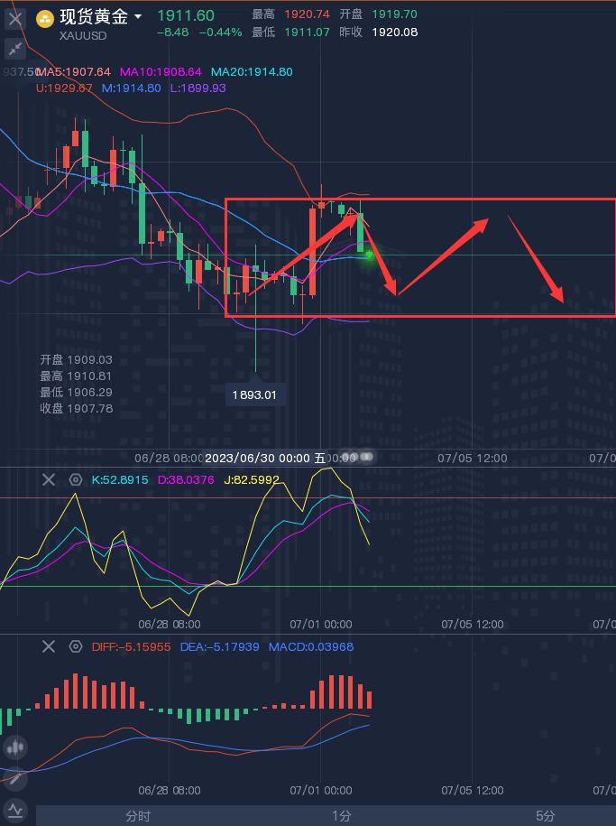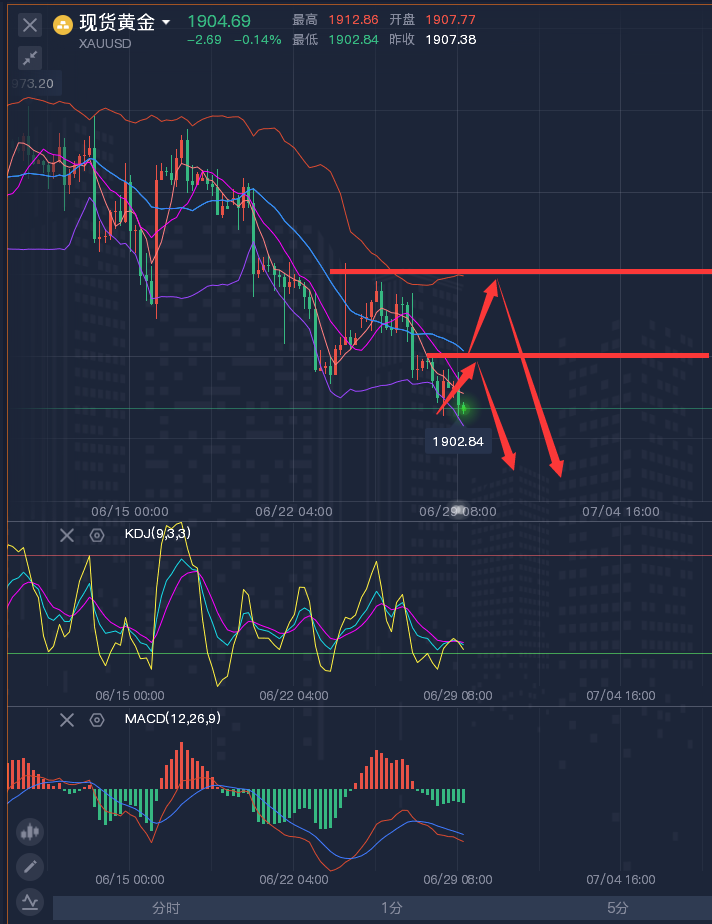 投资的本身就是一种对自身的修炼。不断的修炼,才能晋升为成功者的行列。想要走的更远,与谁同行才是关键。盈利之道,循序渐进,步步为营!人生重要的不是你以前去过那里,而是你以后要去那里!方向决定成败,思维决定结果!今天想,明天干,后天成功!今天看,明天想,后天落空! ————————消息面 周五(6月30日)现货黄金窄幅震荡,目前交投于1905.44美元/盎司附近,虽然有逢低买盘帮助金价守在1900关口上方,但隔夜美国经济数据相对强劲,美联储主席鲍威尔重申加息立场,仍令金价承压。交易员们在等待今日晚些时候公布的美国关键通胀数据——美国5月个人消费支出(PCE)物价指数数据,预计核心PCE同比上升4