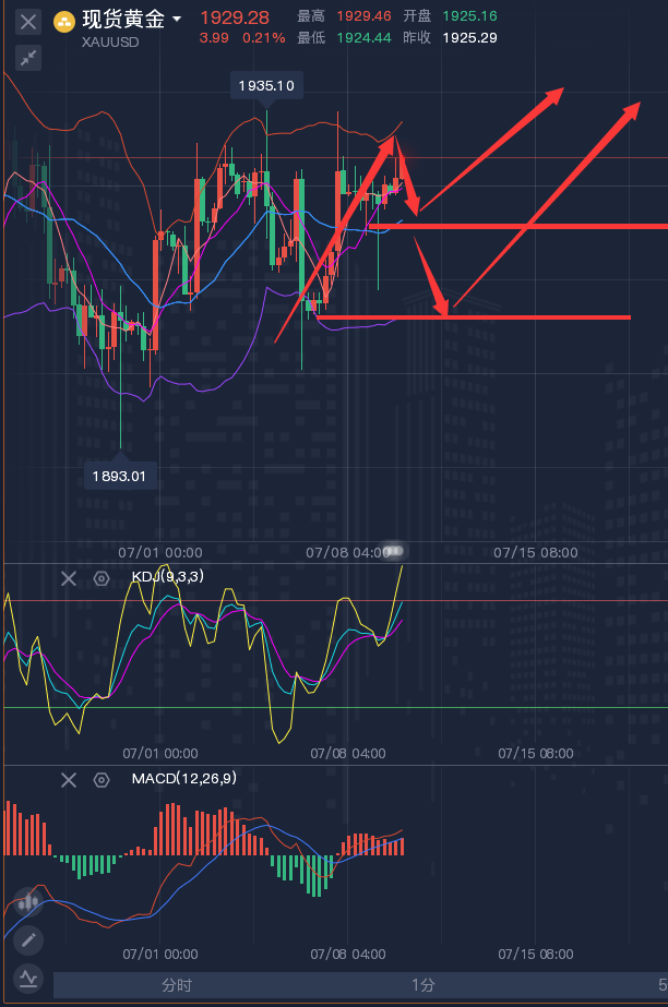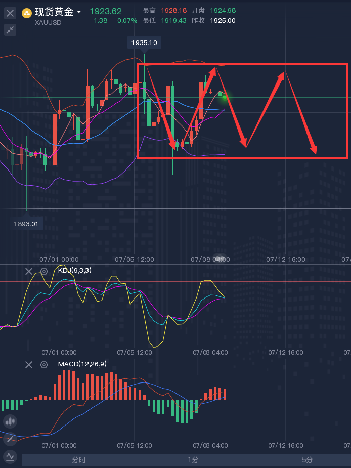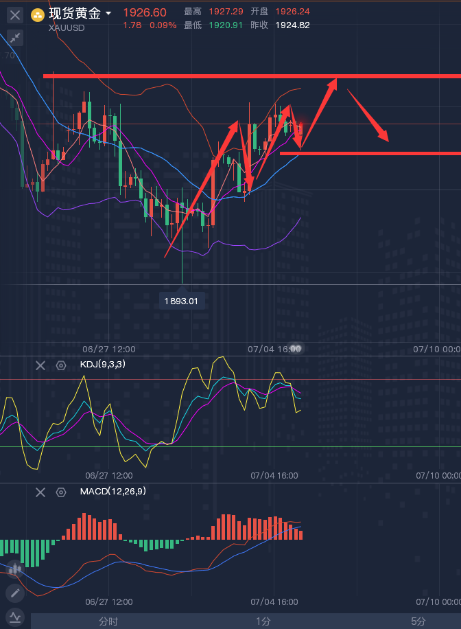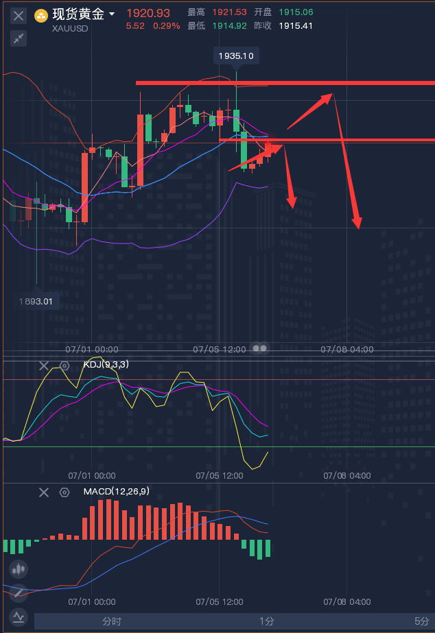 分析看实力,操作看魄力,说的天花乱坠不如给你一个神单,事后放肆吹嘘不如事前为你布局。龚关铭作为各大知名财经网站的特约撰稿分析师,每日都会在网上实时更新文章,十年如一日从不敢懈怠,策略都是早于行情之前给出,也绝对不会事后再讨论的,不同于那些整天把一张张盈利晒在文章里但是却不敢实时给出策略的分析师,龚老师的策略全都透明化的呈献给读者,所以实力经受百万千万客户查证认可,名声全靠客户信誉积累! ————————消息面 周三(7月5日),现货黄金在近一周高位附近窄幅震荡,目前交投于1924.30美元/盎司附近,投资者普遍等待美联储发布最新货币政策会议记录以及其他经济数据出炉,市场交投比较谨慎。周一美国