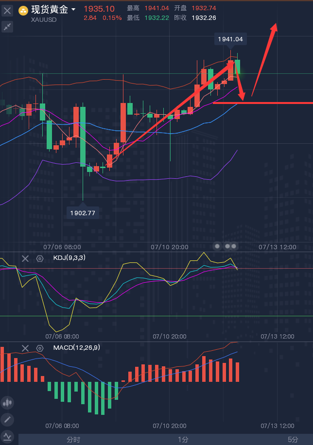 当你的才华还撑不起你的野心时,那就要静下心来学习,当你的能力还驾驭不了你的目标时,那就应该沉下来历练,只有通过学习、交易、总结,你才会明白,其实自己真的不是不被市场接纳,只是以前不愿意改变而已,投资有两种,一种生理性投资,是为了解决温饱,另一种,属于精神投资,是实现人生的价值,是与人性的贪婪和恐惧进行博弈和赛跑。 ————————消息面 周三(7月12日),现货黄金小幅上涨,一度创近三周高点至1938.94美元/盎司,美联储官员周一关于美联储接近加息周期尾声的言论继续发酵,美元指数一度刷新近两个月低点至101.37,有望连续五个交易日下跌,美债收益率也延续跌势,给金价提供支撑。不过,周二纽约
