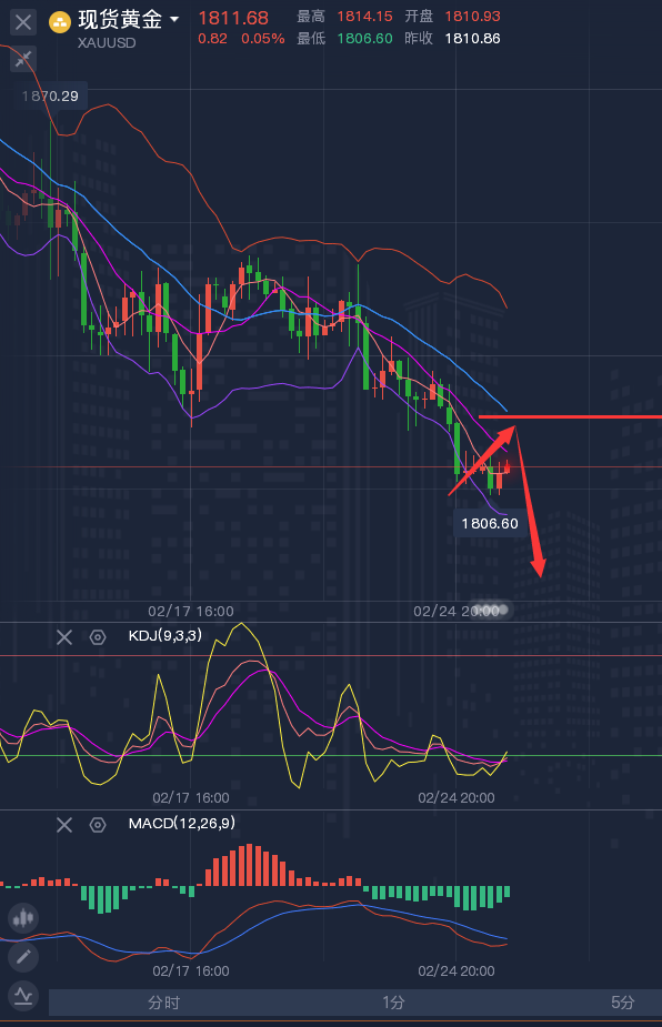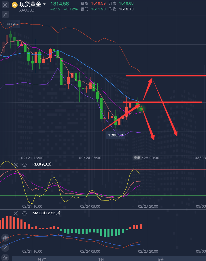 做投资前你必须要明白一件事:做投资,资金是你的,保障是你的,万一赔钱也是你的,最后赚钱也是你的!投资永远是留给有规划、有责任心的人,我的时间也只留给信任我的有缘人!最好的实力体验就是长期的观察一个老师每天的思路,而不是简单的一个现价单子就将你躁动的内心平静。投资者与分析师始终是双向选择的关系,相互尊重,彼此信赖才有可能实现真正的合作,有了合作才可能实现共赢! ————————消息面 周一(2月27日)现货黄金震荡下跌,目前交投于1808美元/盎司附近。上周五金价持续走弱,一度创近八周新低至1808.84美元/盎司,因为美国1月份PCE强于市场预期,提升了市场对美联储更高终端利率的预期,美元指