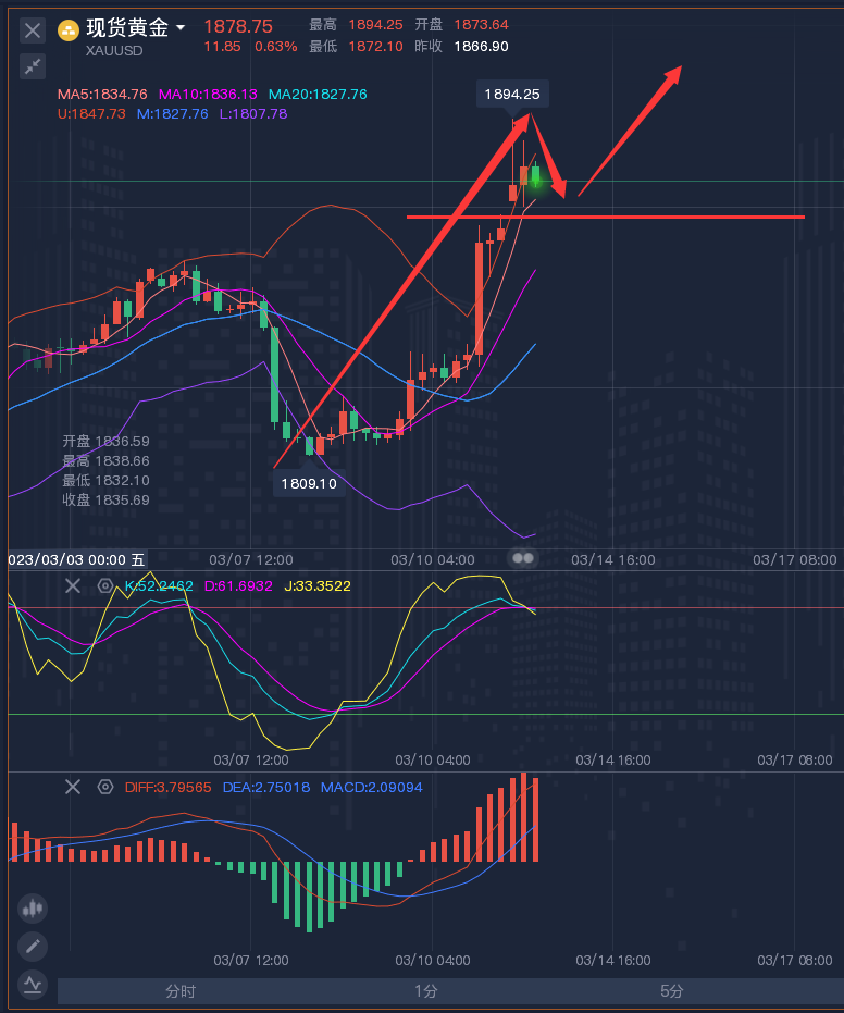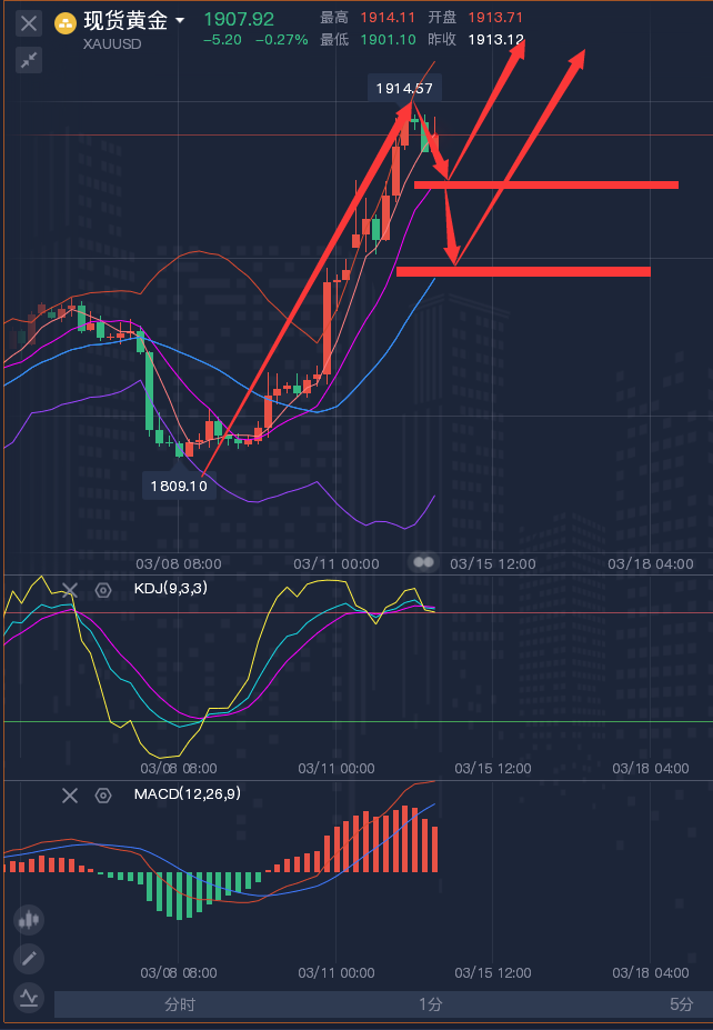 在市场上,有3句至理的名言:一是市场按趋势波动,二是历史会重演,三是市场包含一切。市场上最大的敌人是你自己,相信市场的力量,趋势做单,机器性的操作,不要感情做单,黄金市场是个公开,公平,公正的市场,只有你战胜了自己,才能战胜市场。 ————————消息面 周二(3月14日)现货黄金小幅走弱,目前交投于1903.80美元/盎司附近,过去几个交易日美元和美债收益率大跌,帮助金价大涨,周二将迎来美国2月份CPI数据,市场观望情绪较浓,一些投资者获利了结,美元指数温和反弹,金价则随之展开回调。不过,在美国两大地区性银行倒闭后,市场预期美联储升息力度将减弱,市场目前普遍预期美联储将在下周的政策会议上加