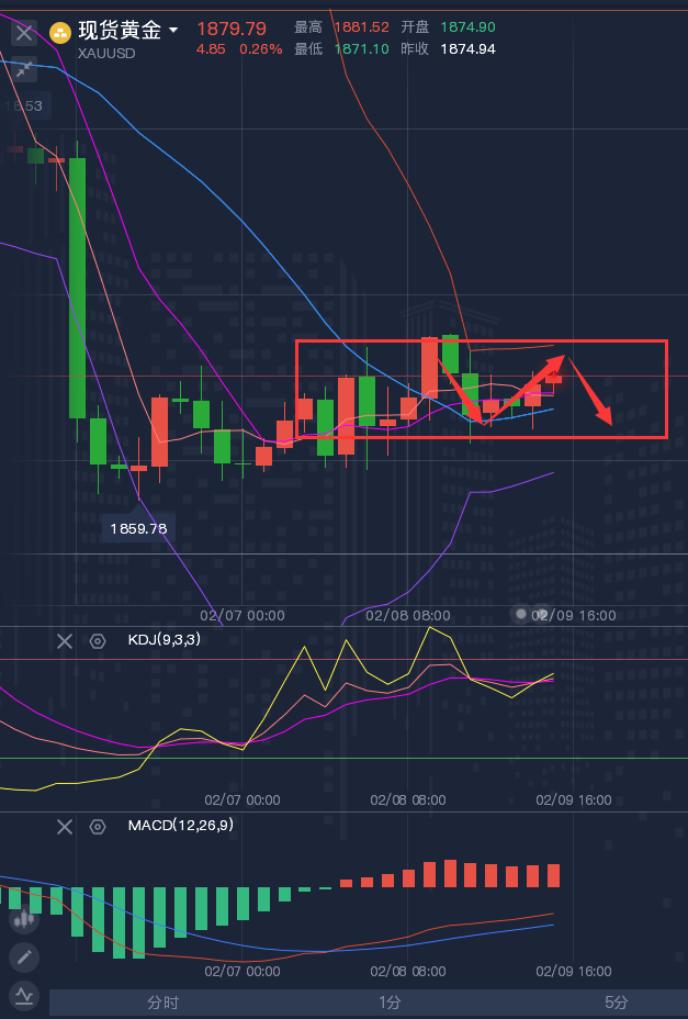 市场给予每一个人的机会都是公平的,或许在机会面前你选择了停留,有的人选择了把握,造成了看似的不公平,一波趋势确立后,就要懂得跟随,会跟的人才会有慧根,交易总是会有顺或者不顺的时候,顺的时候不必沾沾自喜,因为这很有可能就是不顺的开始,不顺的时候也不必垂头丧气,交易有赚有亏,勉强不来,你垂头丧气并不能改变当前的局面,要懂得用辩证法让自己不断的前行,只有一个积极健康的心理才会支撑你走的更远。 ————————消息面 周四(2月9日),现货黄金震荡微涨,目前交投于1879.43美元/盎司附近,上周靓丽的非农数据后,本周美联储官员的讲话并没有特别的鹰派,美联储决策者仅支持以更小幅度加息,美债收益率走弱