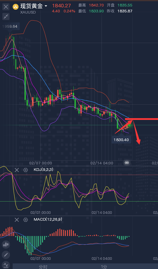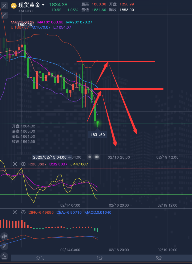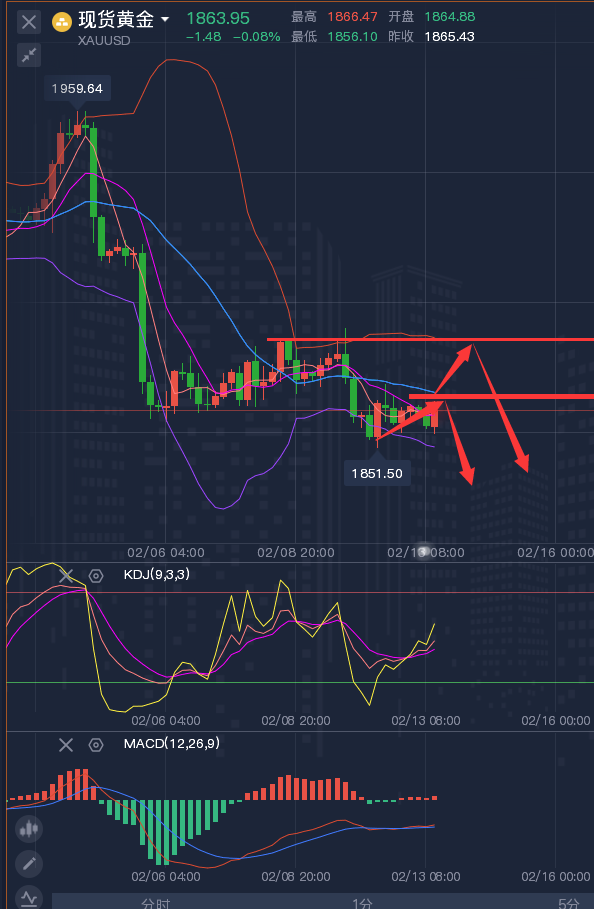 方向对了不怕路远,用时间见证实力,用实力赢得未来,让信任成为利润,用利润解除疑惑。一样的行情,一样的时间,不一样的结果。交易切记不要意气用事,市场专治各种不服,所以一定不要扛单,相信很多人都深有体会,越抗越慌,浮亏不断放大,搞的吃不好睡不好,还白白错过很多机会。唯有顺势而为,才是王道。如果你也有这些烦恼。如果你还在行情中迷惑,涨也怕,跌也怕,不妨跟上老龚的节奏,看看能否让您豁然开朗。 ————————消息面 周一(2月13日)现货黄金小幅走弱,目前交投于1859.55美元/盎司附近,因为在上周五美国劳工部上调了美国12月份CPI数据后,市场预计美国1月份通胀增速可能会回升,给美元提供上涨动能