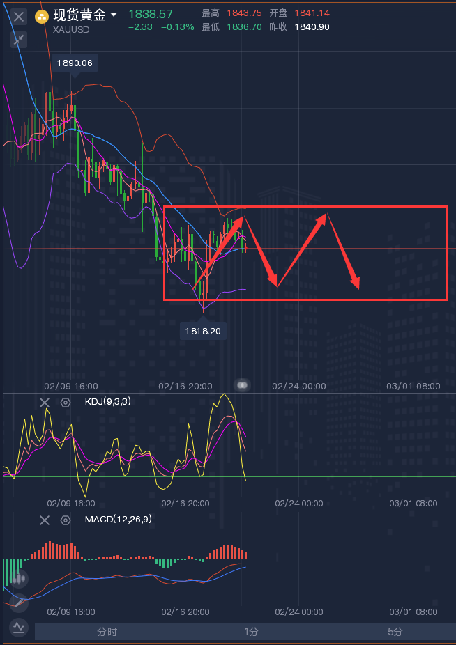 交易是一个耐心等待机会出现的过程,按兵不动并不是因为不知所措,而是因为成竹在胸,95%的利润永远来自于5%的交易,守株待兔是一种交易策略。市场是一个有经验的人获得更多金钱,有金钱的人获得更多经验的地方,每个新手都会从失败的教训中吸取经验,聪明的人则从专业团队的帮助中获利 ————————消息面 周二(2月21日)现货黄金震荡微跌,目前交投于1838.20美元/盎司附近,虽然之前有逢低买盘和避险买盘支撑金价,但市场担忧美联储会加息至更高的终端利率,美元相对坚挺,令金价持续承压。本交易日将迎来欧美国家2月份PMI数据,市场普遍预计数据将好于1月份的表现,这可能会降低市场对全球经济衰退的担忧,可能