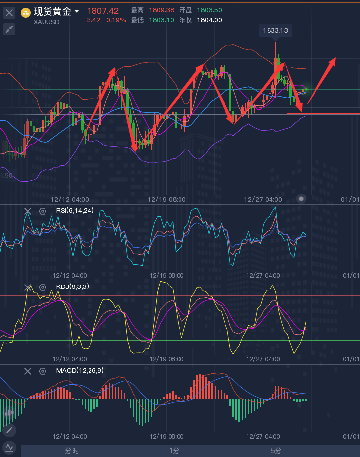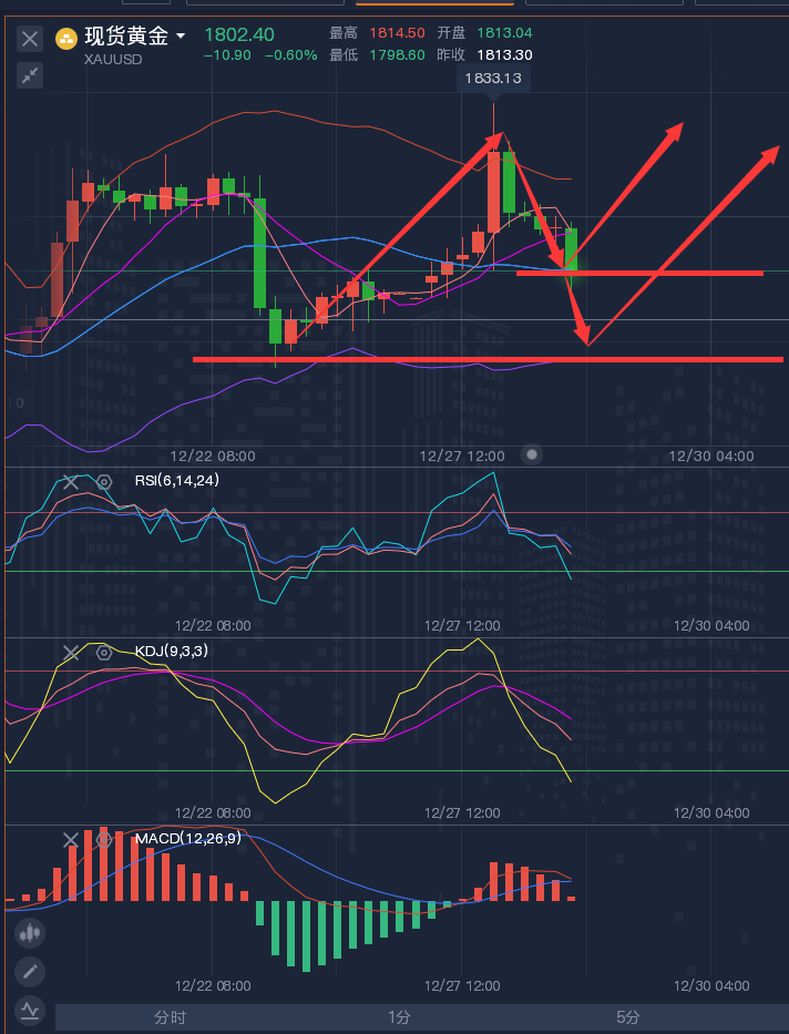 很多朋友在交易中总是纠结最稳健的交易,任何人都不能准确地预测出全天行情走势,也不能直接抓到全天最高点最低点,那么就需要在行情变化中顺势而为,跟风交易。不然在无法预测暂时行情要跌还是要涨的时候,那么只能建议大家选择观望,等待方向走出来,再做有效的交易,这样操作才会既轻松又安全,风险与利润交织,奢望多大的利润就需要承担多大的风险,所以在很多时候我们一直强调风险管理,就是尽量减少不必要的损失。 ————————消息面 周五(12月23日)亚洲时段,现货黄金震荡微涨,目前交投于1795.52美元/盎司附近,隔夜金价大跌后,市场存在一些超跌反弹调整需求。但市场观望情绪较浓,一方面是为了等待晚间出炉的而