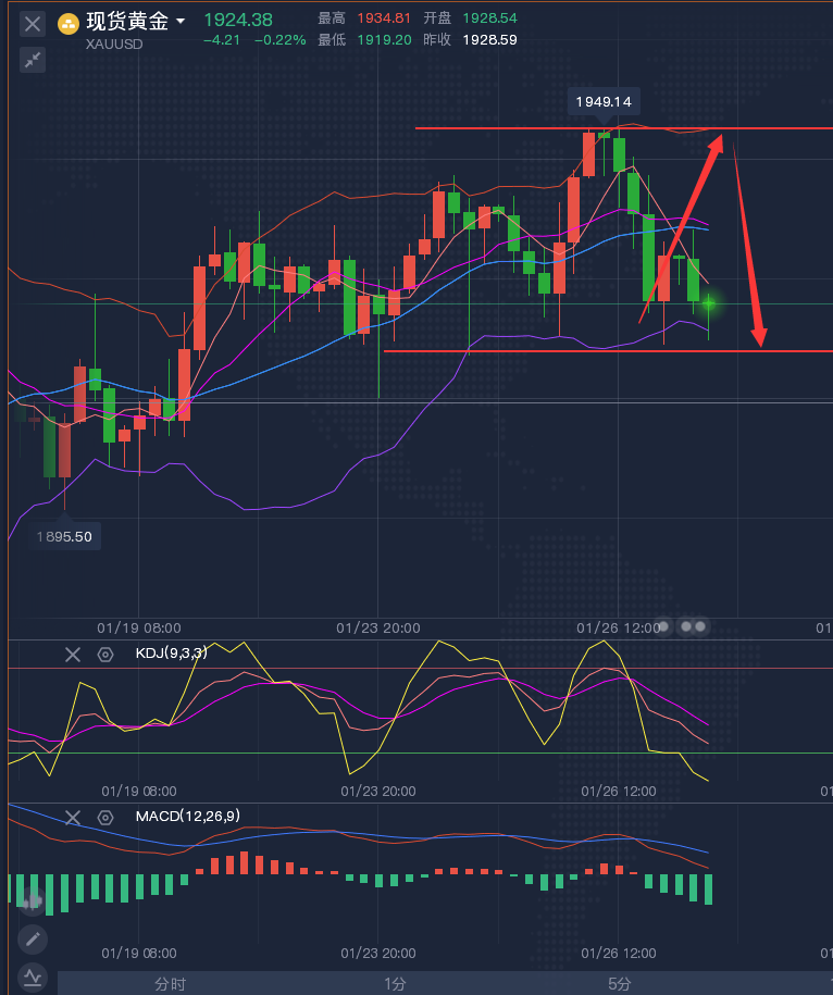 交易本无高手,只是失败的多了,总结的多了,就成长了、成熟了而已,每一个高手都是从学徒开始的,华丽的跌倒,总是胜过无谓的徘徊,不要因恐惧而丧失自信,不要因懦弱而耽误前程。优柔寡断是弱者的天性,而强者眼里没有失败,坎坷都是通往成功路上的一个小景点,你若前进,世界都会为你让路。 ————————消息面 周二(1月24日)亚市盘初,现货黄金震荡微涨,目前交投于1932美元/盎司附近,由于去美元化目前市场非常看涨黄金,黄金可能处于持续上行的风口浪尖……目前,美联储可能越来越多地转向对增长的担忧,放缓其加息路径,允许ETF持仓企稳。关铭认为,美元的持续波动为大宗商品价格大幅上涨提供了一个因素。 原油窄幅
