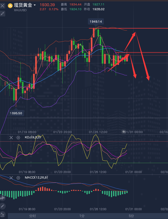 相逢即是缘。俗话说先有伯乐而后有千里马,千里马常有而伯乐却不常有。投资的本身就是一种对自身的修炼。不断的修炼,才能晋升为成功者的行列。想要走的更远,与谁同行才是关键,一个人能走多远,要看他有谁同行;一个人有多优秀,要看他有谁指点;你见多了纸上谈兵,我医多了惊弓之鸟,不知道你愿不愿意做谨言的伯乐,创造双赢。市场凶险,瞬息万变,谨言愿伴你同行,与君共勉。 ————————消息面 周三(1月25日)现货黄金震荡微跌,目前交投于1931.60美元/盎司,美国12月PMI数据连续7个月在荣枯线50关口下方,市场普遍预计美联储下周仅加息25个基点,这继续给金价提供支撑;但周四将迎来美国四季度GDP数据,
