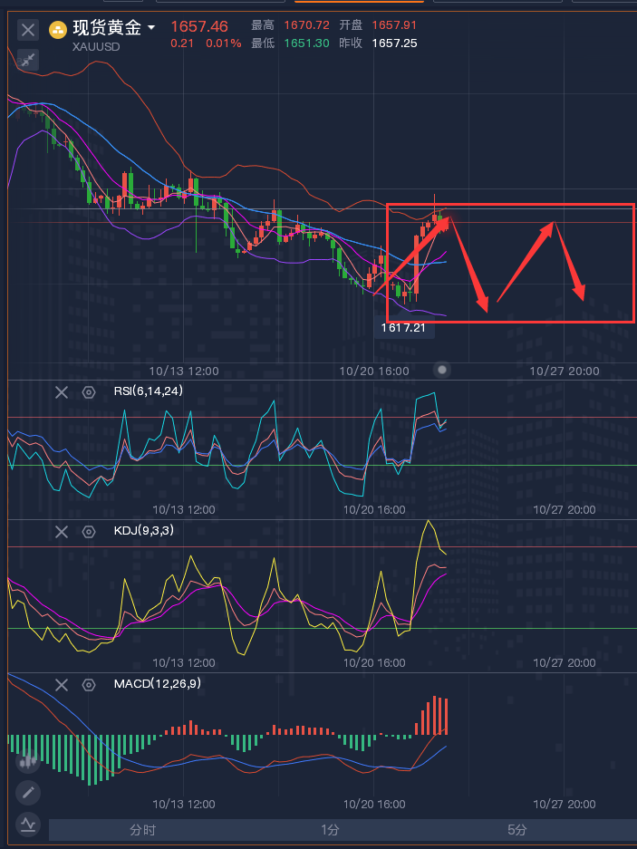 投资路并非坦途,我的文字不华丽,但是却很真诚,你能看到我写的文章,这是一种缘分,我相信缘分,缘分让我们相遇相知,每一份缘分都应该被珍惜,遇到的人不一样,载体不一样,结果就不一样了!选择比努力更重要!选择大于努力,今天的选择或许就是明天的转折!对的时间,跟对的人,做对的事情,这就是投资成功的秘诀,合作只是起点,服务没有终点! ————————消息面 周二(10月25日)现货黄金窄幅震荡,目前交投于1650美元/盎司附近,美国9月PMI数据表现不佳,市场对美联储12月加息75个基点的预期降温,给金价提供支撑,而且周一金价守住了5日均线,暗示多头仍有机会。不过,美债收益率仍然处于十余年的高位,市场