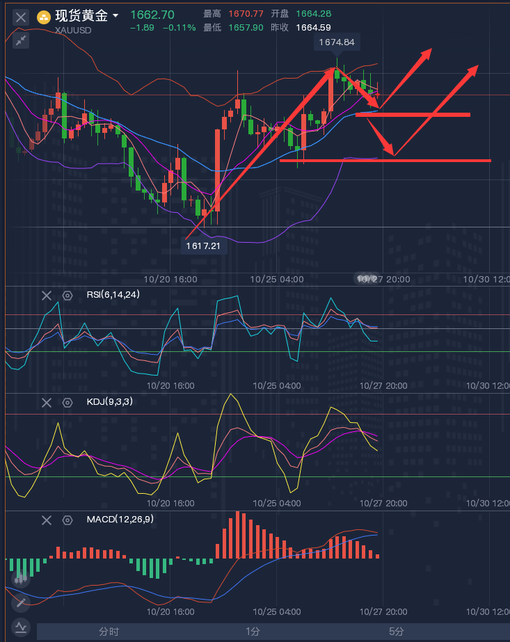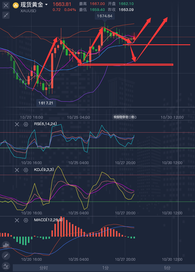 做投资,如果你的能力不足以支撑你现在的状况,那么需要一位军师助你操控大局,一次选择,就是一次转折!一次尝试,就是一次机会!最快的脚步不是跨越,而是继续,最慢的步伐不是缓慢,而是徘徊,最险的道路不是陡坡,而是陷阱,最好的行情不是单边,而是止盈!没有清醒的头脑,再快的脚步也会走歪;没有谨慎的步伐,再平的道路也会跌倒,迈开脚步,再长的路也不在话下,停滞不前,再短的路也难以到达。 ————————消息面 周四(10月27日),现货黄金震荡交投于1662美元/盎司附近,市场对美联储12月加息75个基点的预期降温,美元和美债收益率隔夜大跌,美元指数周四延续弱势,一度创近五周低点至109.54,继续给金价