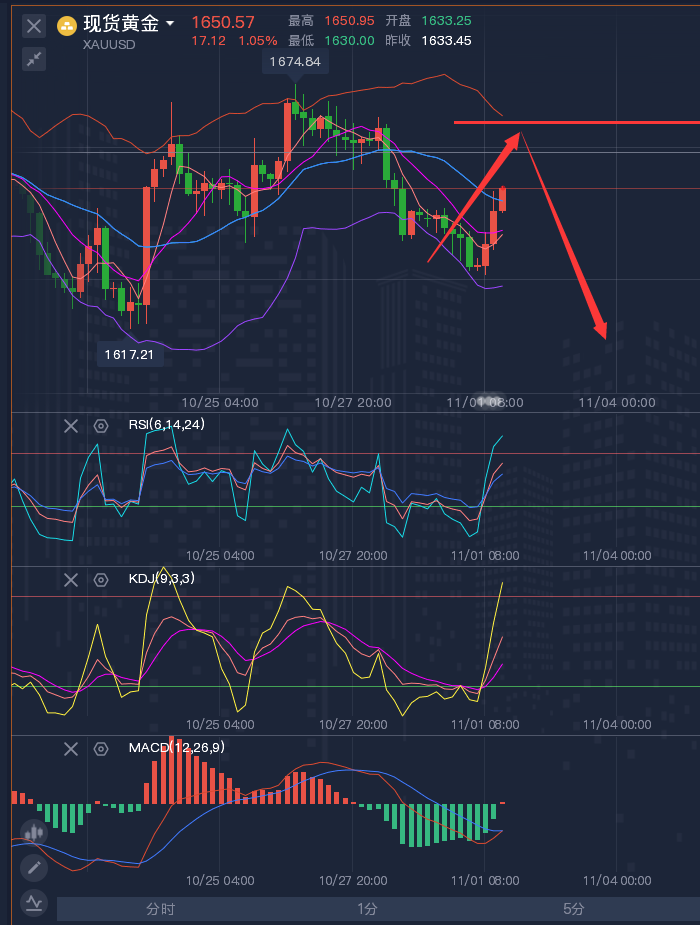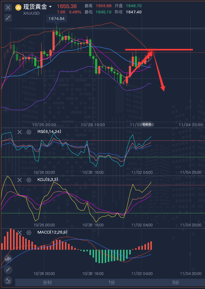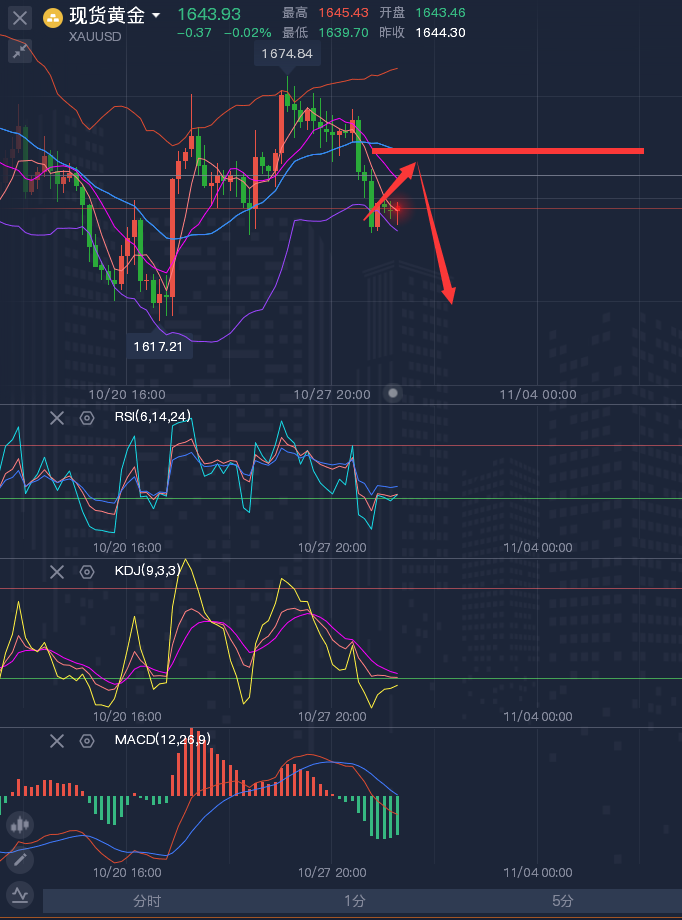这个市场,验证了人心,见证了人性,关铭的文字不华丽甚至枯燥,但是却很真诚,记住盈利的投资者是一个旅程,而非目的地,试着每天交易的更好一些,从自己的进步中得到乐趣,聚精会神学习技术分析的技艺,提高自己的交易技巧,而不是仅仅把注意力放在自己交易输赢多少上,同时亏损的投资者要保持一颗良好的心态勇敢的去面对这个市场,选择大于努力,选择比努力更重要!今天的选择或许就是明天的转折! ————————消息面 周一(10月31日)现货黄金震荡微跌,目前交投于1642美元/盎司附近,上周数据显示,美国核心通胀压力依然很高,巩固了美联储本周将再次大幅加息的预期,美元和美债收益率攀升,令金价承压下跌逾1%,短线下