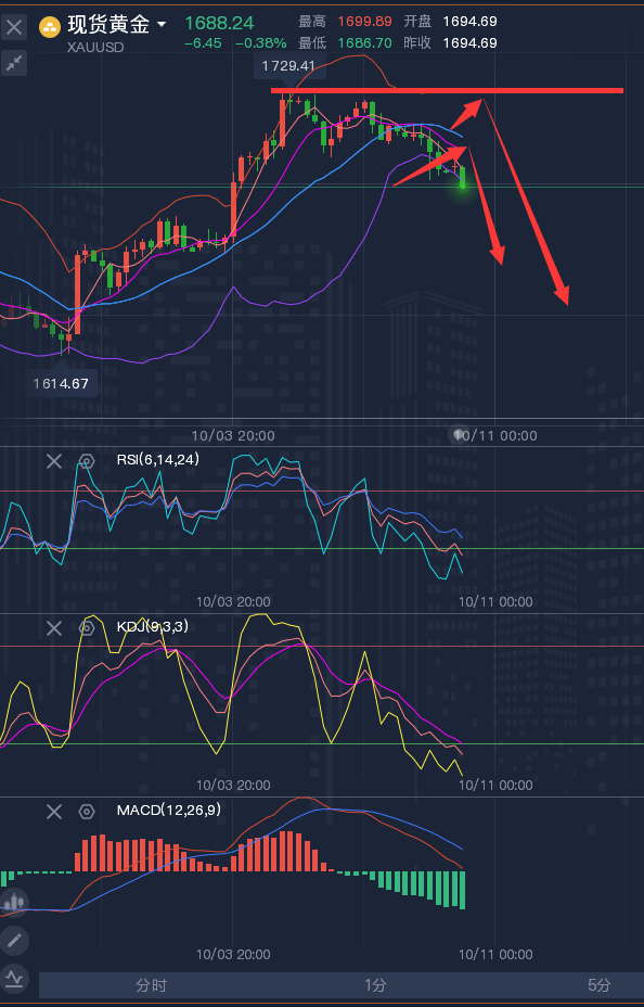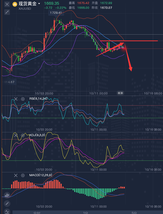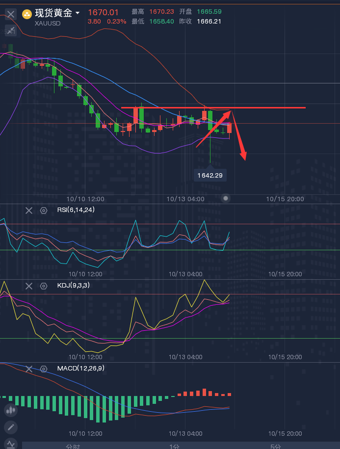 当你点开这篇文章就代表,你相信我的实力;你敢进入有风险的投资市场,那么也就代表你有野心;投资交易并不难,可是却还是有不少的亏损的朋友,这说明什么?说明我们曾经盲目,曾经失误,曾经选择错,既然错了,那么就要改正,没有注定的亏损,只有不努力的我们;既然对市场还有渴望和期待,那何不跟我感受一下这个市场的魅力!——我是分析师龚关铭,不是所有的都适合,合适的只有一个。你不将就,我不敷衍,愿投资路上幸运与你同行,盈利与你相伴! ————————消息面 周五(10月14日),现货黄金探底回升,目前交投于1668美元附近,隔夜数据显示美国核心通胀仍创下近40年新高,强化了美联储进一步激进加息的预期,金价一度