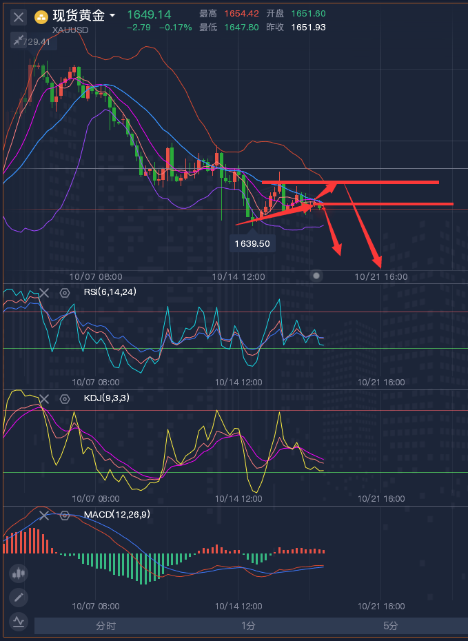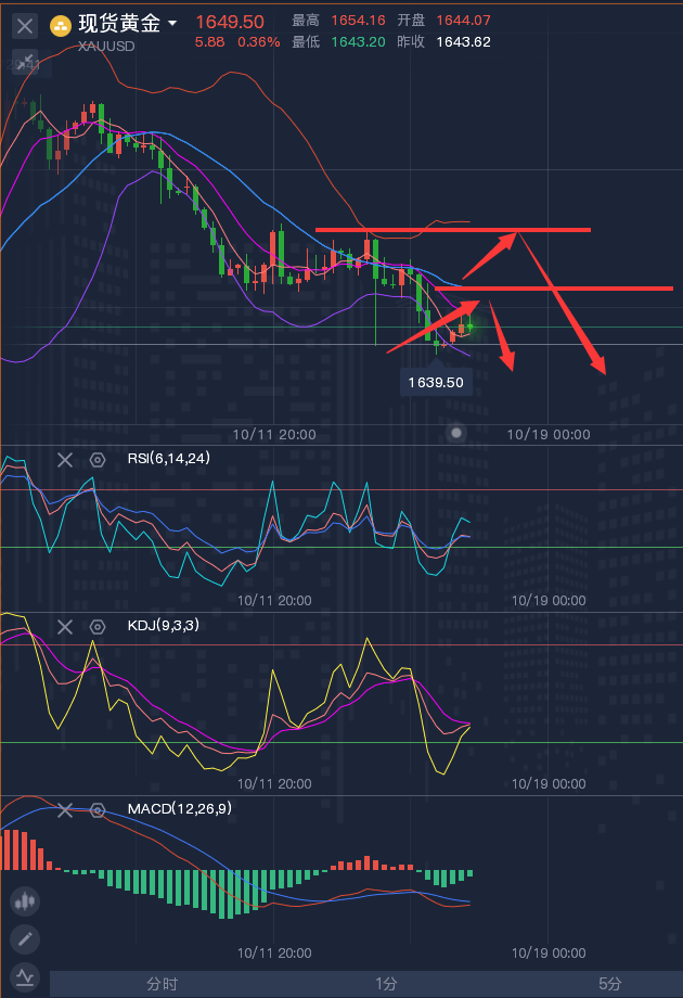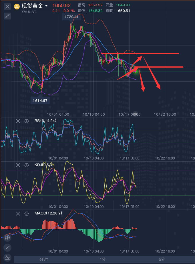 新手的特点就是不懂技术,盲目进场。他们每次交易只考虑第一个问题:认为只要预判了市场涨跌就可以去做这笔交易。这种重方向、轻位置的做法使得交易者一败涂地。其实,顺势而为的“势”跟“方向”是有很大差别的,因为市场的运动方向呈现震荡的形态运行,而市场的趋势往往是全局性的。在我这里,我能做的是帮你合理的把控仓位,利用支撑和阻力位下单,让每一单有理可依,有迹可循。买卖点位不应该是随意进场,请对自己的资金负责。 ————————消息面 周三(10月19日),现货黄金窄幅震荡,延续隔夜的震荡走势,目前交投于1652美元/盎司附近,本周无重磅经济数据出炉,英国财政政策担忧情绪也有所降温,市场观望情绪渐浓;一方