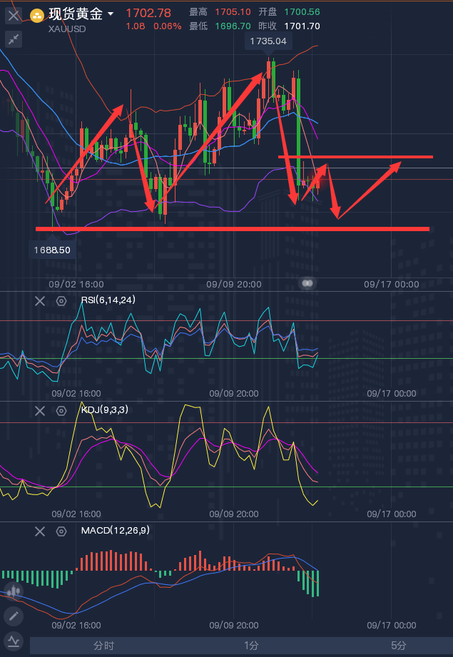因为专业、所以领先,没有尔虞我诈,只有一颗真诚的心;没有百分百的准确,只有稳定的盈利;不做马后炮,让每一个盈利都真切并真实的让你感受并为之受益。龚关铭专注分析现货黄金、美原油、伦敦金、外汇黄金原油等金融理财投资产品。专业团队在线分析,一对一即时指导,为大家规避风险,扩大利润,让各位随时随地第一时间知道国际市场动向,做最稳健的单子。 ————————消息面 周三(9月14日)现货黄金窄幅震荡,目前交投于1702.36美元/盎司,隔夜出炉的美国8月CPI数据意外强于预期,强化了下周美联储决议至少加息75个基点的预期,甚至出现了加息100个基点的预期,帮助美元录得逾两年最大单日涨幅,目前美元守住了