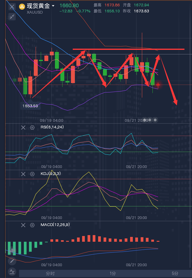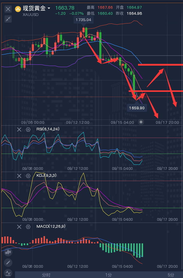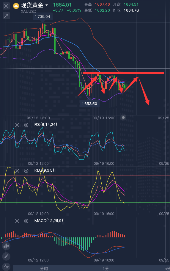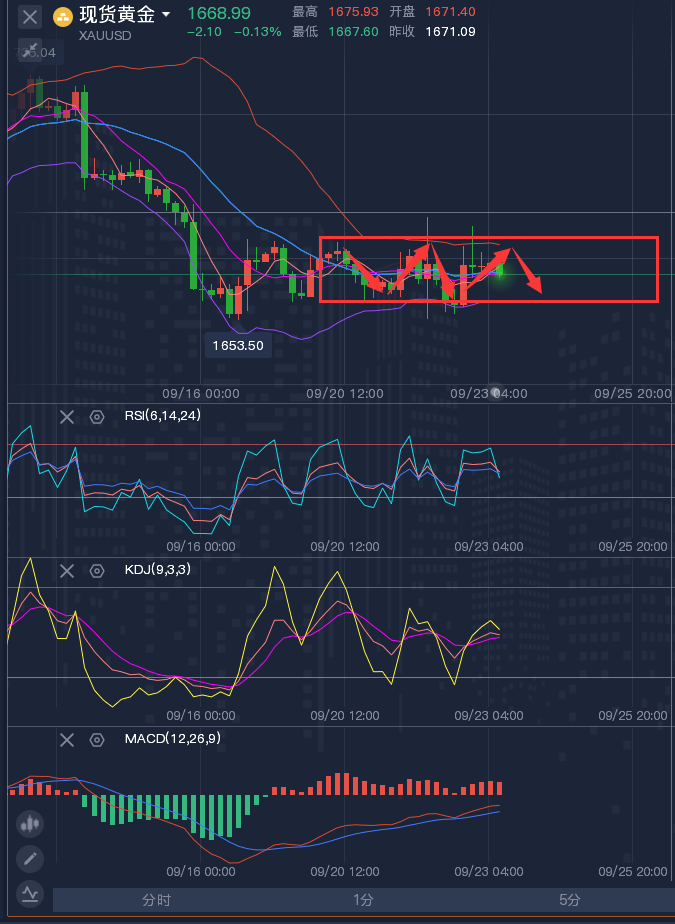 投资理财不是一朝一夕的事,前期的亏损,不代表后期的亏损;前期的获利,不代表后期的获利。我的指导思路,授人以鱼不如授人以渔,帮助找到我的朋友建立起一套自身的操作思路,真心将技术授予你,让你明白在这个市场你正在做的是什么,有何依据。一次选择,就是一次转折!一次尝试,就是一次机会!在我的投资生涯中,我一直都坚持这样的投资理念:投资最重要的不是你一次能够赚取多少,而是你能不能控制风险,落袋为安,长久地立足生存。 ————————消息面 周五(9月23日)现货黄金震荡微涨,目前交投于1671.50美元/盎司附近,虽然全球多数央行的加息前景尤其是美联储仍将大幅加息的预期,仍对金价压制明显,但美元指数周四