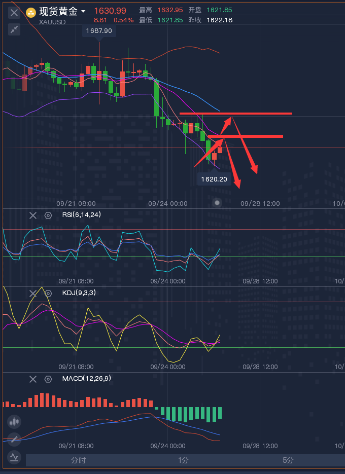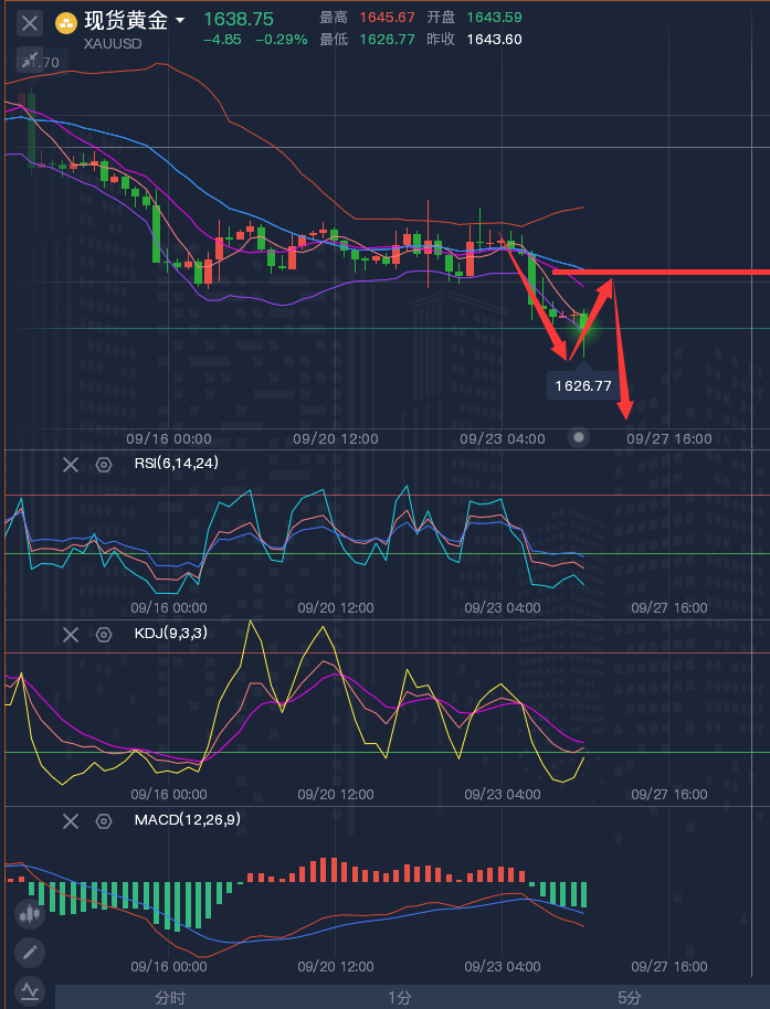 对于想学习黄金、原油知识的朋友,我很赞同。我个人认为投资朋友在投资的过程中提高自身能力,用自己所掌握的技术知识来分析及操作,并乐在其中,爱上这个投资而不是恐惧。恐惧是因为没有实力没有判断力。我比较崇尚那些在老师指导的过程中去慢慢学习掌握常用的技术指标(均线、MACD、KDJ、支撑位、阻力位等)结合基本面来进行分析行情走势及具体的操作点位,逐步地提高自己的综合分析能力,并锻炼自己的心态。慢慢一步步成长起来,毕竟投资是一个长期的过程。正所谓授之以鱼不如授之以渔。 ————————消息面 周一(9月26日)亚市盘初,现货黄金延续上周五跌势,一度刷新逾两年半的至1626.60美元/盎司,因英国***