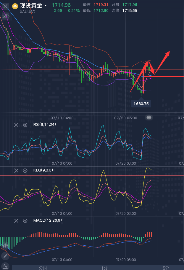 最大的悲哀,就是你看准了行情,结果没有敢做,胜利不是战胜市场而是学会提高自己。不学者,虽存,谓之行尸走肉耳,如果你总是想一步登天,一夜暴富,那么你必将摔的体无完肤,投资最宝贵的品质是不腻想,不预测,不自以为是,不自作聪明,不放弃自我,紧跟市场的脚步。 ————————消息面 周五(7月22日)现货黄金窄幅震荡,目前交投于1713美元附近,守住了隔夜大部分涨幅。隔夜金价探底回升,盘中一度跌至1680关口附近,为近16个月新低,但在欧洲央行加息50点之后快速上涨,一度触及1720关口,一方面是美元走弱,使黄金对海外买家的吸引力增加,另一方面是美债收益率下跌,再加上地缘局势担忧升温,逢低买盘和避险