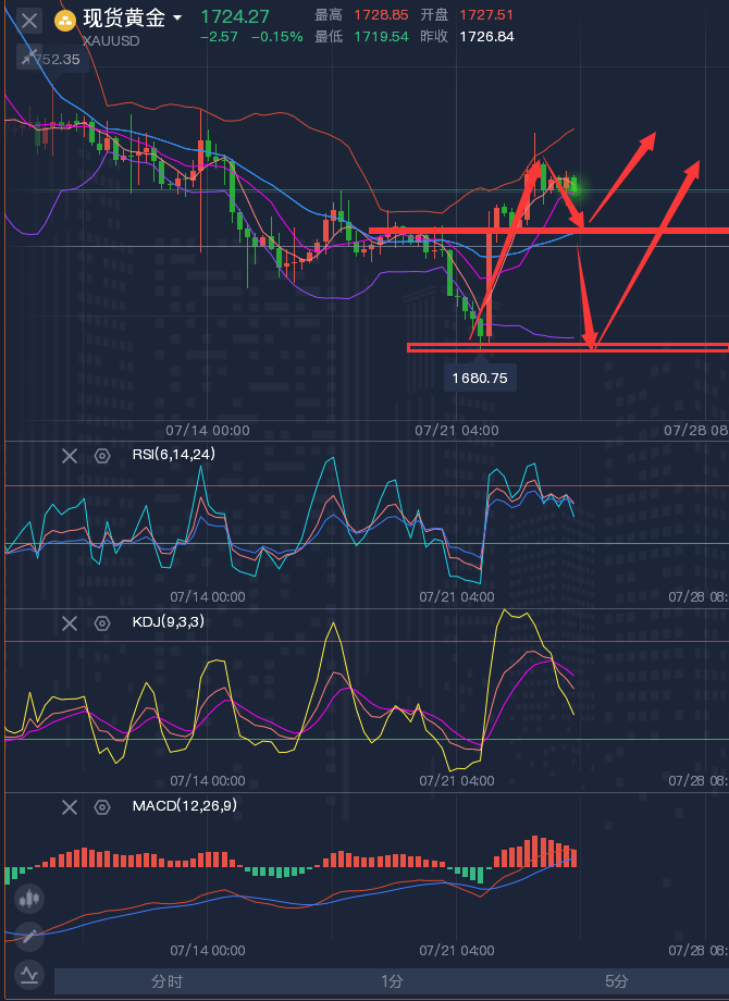 市场就象一个伟大的财富分配器,不断的以庞氏的方式潮起潮落,不断带来财富的快速转移。以黄金为鉴,可以知文明兴衰;以黄金为镜,可以明国家得失;以黄金为友,可以握天下乾坤!可以毫不夸张地说,明白了黄金,你就明白了"齐家,治国,平天下"之道! ————————消息面 周二(7月26日)现货黄金在1720关口附近徘徊,投资者为本周晚些时候预期将加息75个基点做准备,美债收益率小幅上涨,令金价承压,但市场观望情绪也比较浓厚,因为本周还将迎来美国二季度GDP和7月PCE数据。不过,地缘局势依然紧张,市场对美国经济衰退的预期挥之不去,美元周一在逾两周低位附近徘徊,,短线来看,没有仍有进一步回调风险,考虑到地