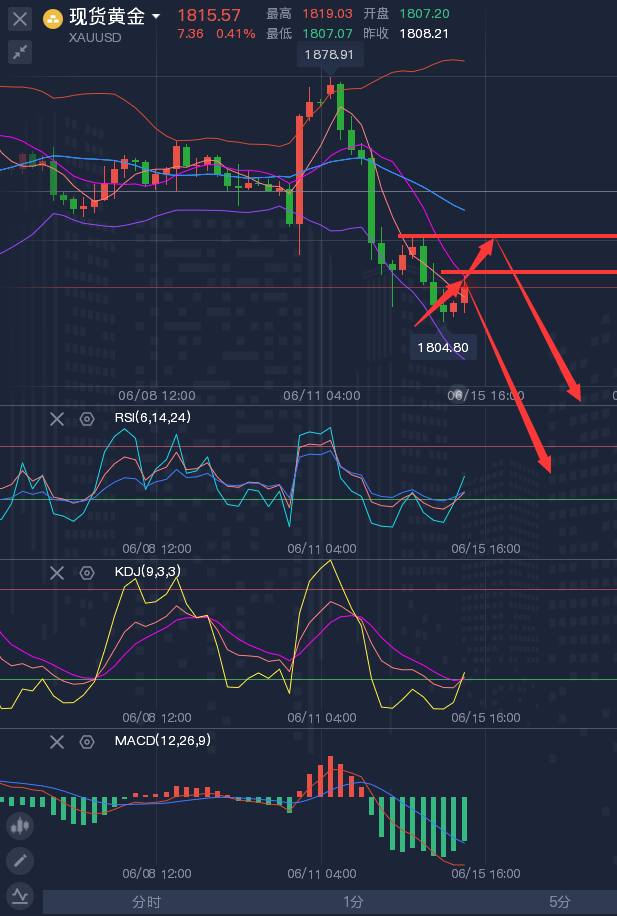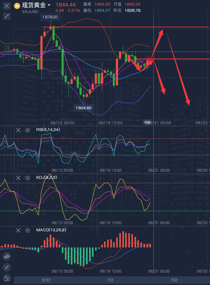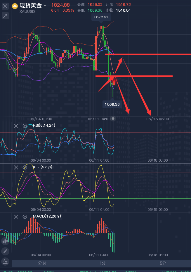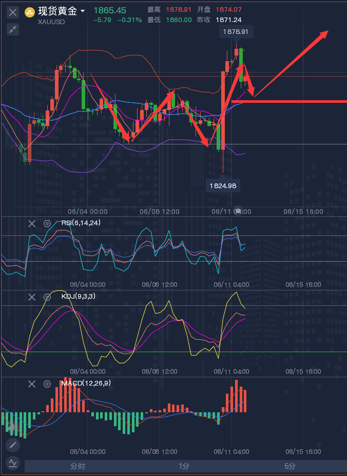 在我这里,我能做的是帮你合理的把控仓位,利用支撑和阻力位下单,让每一单有理可依,有迹可循。买卖点位不应该是随意进场,请对自己的资金负责。文章的开头龚关铭想说,如果你对行情真的无法把握,可以前来找到龚关铭,多一个分析师对你来说没有任何损失,永远记住一句话,专业的人做专业的事,一切实战只为盈利,合作只为双赢。 ———————消息面 周一(6月13日)现货黄金高开低走,通胀担忧和经济衰退担忧一度帮助金价涨至1878.65美元附近,但因为强于预期的美国CPI也提升了美联储激进加息的预期,甚至本周加息75个基点的预期也有所升温,在上周录得近六周最大涨幅后,周一美元指数延续涨势,刷新近四周高点至104.