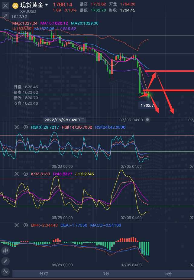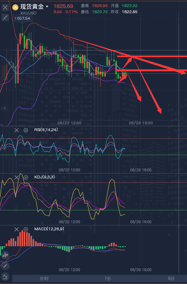 做投资前你必须要明白一件事:做投资,资金是你的,保障是你的,万一赔钱也是你的,最后赚钱也是你的!投资永远是留给有规划、有责任心的人,我的时间也只留给信任我的有缘人!最好的实力体验就是长期的观察一个老师每天的思路,而不是简单的一个现价单子就将你躁动的内心平静。投资者与分析师始终是双向选择的关系,相互尊重,彼此信赖才有可能实现真正的合作,有了合作才可能实现共赢! ————————消息面 周二(6月28日),现货黄金窄幅震荡,目前交投于1825美元/盎司附近,隔夜因为美国国债收益率反弹,令金价小幅走弱,不过,市场调低了美联储激进加息的预期,美元指数小幅走弱,而且G7会议商讨强化对俄罗斯的制裁,而且