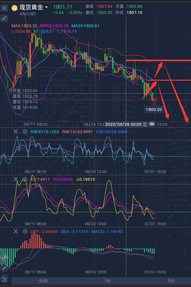 新手的特点就是不懂技术,盲目进场。他们每次交易只考虑第一个问题:认为只要预判了市场涨跌就可以去做这笔交易。这种重方向、轻位置的做法使得交易者一败涂地。其实,顺势而为的“势”跟“方向”是有很大差别的,因为市场的运动方向呈现震荡的形态运行,而市场的趋势往往是全局性的。在我这里,我能做的是帮你合理的把控仓位,利用支撑和阻力位下单,让每一单有理可依,有迹可循。买卖点位不应该是随意进场,请对自己的资金负责。 ————————消息面 周三(6月29日)现货黄金窄幅震荡,目前交投于1820美元/盎司附近,隔夜美联储官员承诺快速加息,反驳对经济衰退的担忧,帮助美元指数反弹,录得逾一周最高收盘价,令金价承压。
