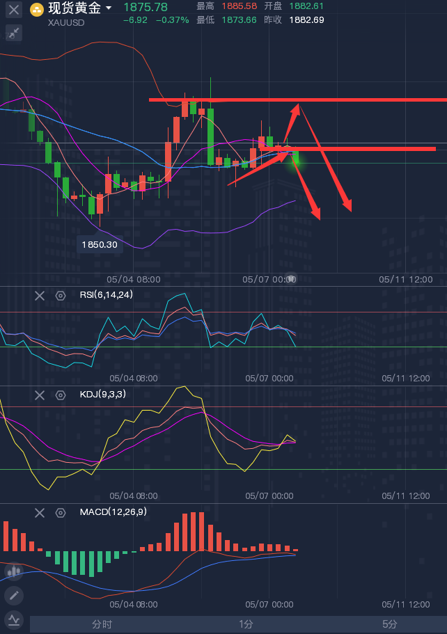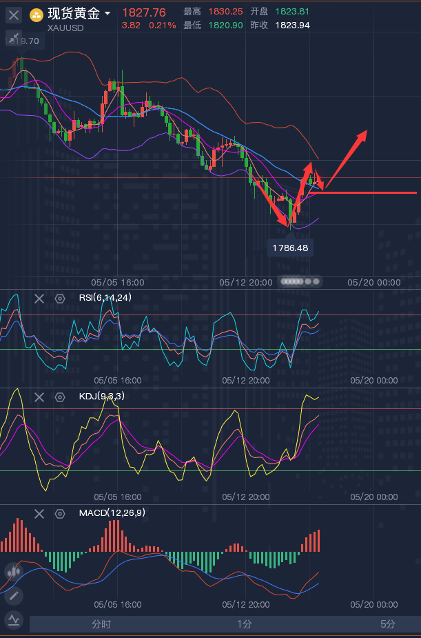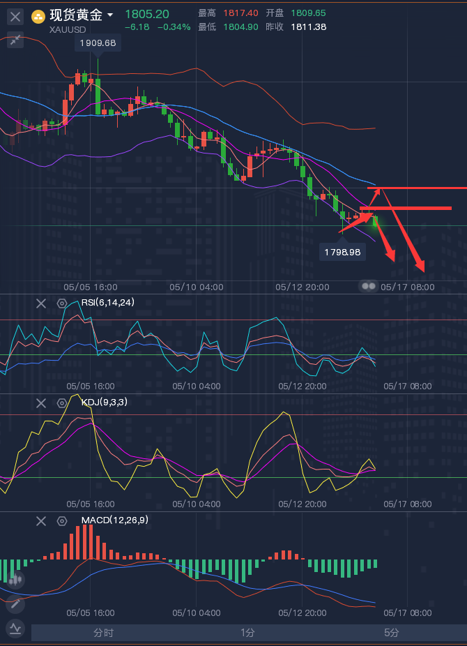 风的方向由树决定,水的方向由山决定,人生的方向由眼光决定,交易的方向由行情决定。当行情运行到一个关键点的时候,我会毫不犹豫的进场交易,即使错了,我认为错在关键点也是值得的。不追求短期的暴利,也不追求一夜暴富之后又一夜回到解放前的刺激,投资市场没有常胜将军,但却有稳定获利的人,这里比的不是谁走的快,而是谁走的稳走的远。要想打败敌人,必先武装自己,凡事循序渐进则步步为营,功厚者必大成。 ——————————消息面 周五(5月13日)现货黄金探底回升,一度创逾三个月新低至1810.07美元/盎司,因鲍威尔重申美联储6月和7月可能各加息50个基点,投资者押注美联储将坚持激进加息,进而蜂拥买入美元,帮