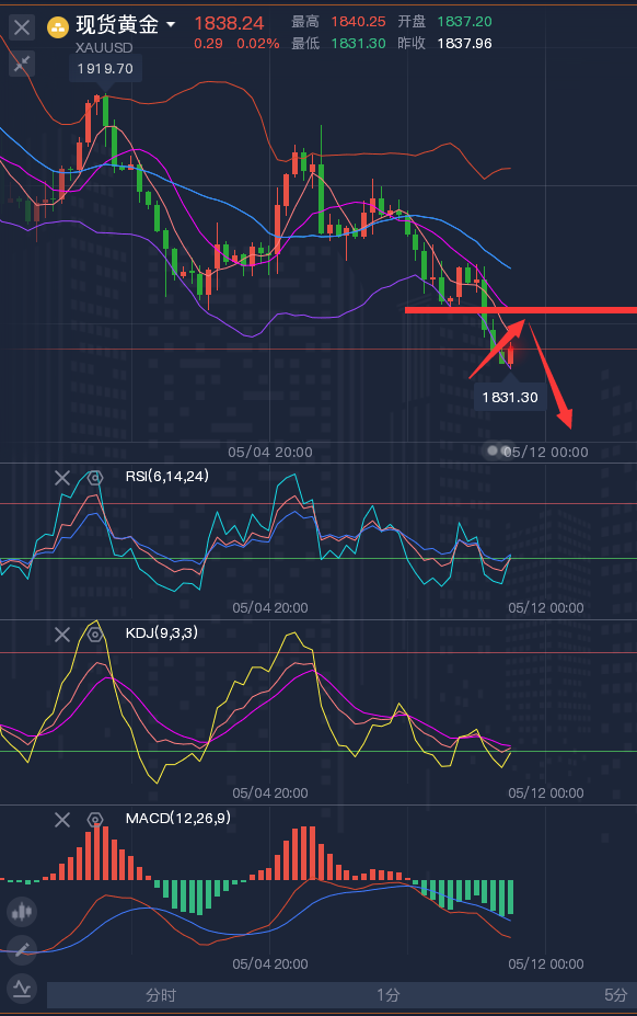 好茶不怕细品,好事不怕细论,活鱼会逆流而上,死鱼才随波逐流。在面对行情也是一样,百句空言,不如一个行动,精准策略,不如一次执行。市场中最可怕的不是没有行情,不是没有机会,而是茫然,一个不知道去哪里人,面朝哪个方向都是逆向,任何一个方向吹来的风将都是逆风!缘来不拒,缘走不留,茫茫人海相识成为朋友也是一种缘分。佛渡有缘人,我带有心人!龚关铭期待与你成为朋友!龚关铭愿做您投资道路上指点迷津的伯乐,更愿做您的知心好友!实力打造精典,成功绝非偶然! ——————————消息面 周三(5月11日)现货黄金延续跌势失守200日均线,一度创近三个月新低至1831.30美元/盎司,因美元重拾升势,同时投资者将