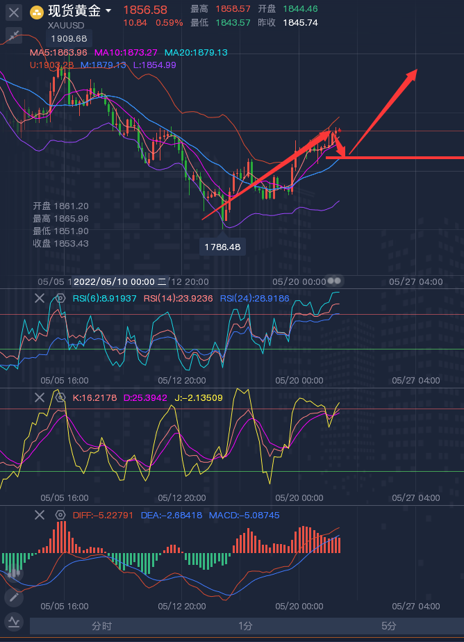 没有目标而生活,恰如没有罗盘而航行,没有计划的出行,犹如没有方向的流浪,丢了资金要赚回来,丢了的自己,要记得捡回来……没有那么多拾金不昧的英雄,只有更多不在大意的自我,别人捡到的是财富,而自己丢的是教训,人生总有赶不上的航班,投资哪有那么多准点的起飞。 ————————消息面 周一(5月23日),现货黄金震荡走高,一度创逾一周新高至1858.05美元/盎司,一方面,投资者对美国升息带动美元升势的预测降温,对美国经济衰退的担忧升温,美元持续走弱,创近三周新低,给金价提供支撑;另一方面,俄乌战火持续,也给金价提供避险支撑。 原油小幅上涨,目前交投于111.10美元/桶附近,即将进入美国驾驶高峰期