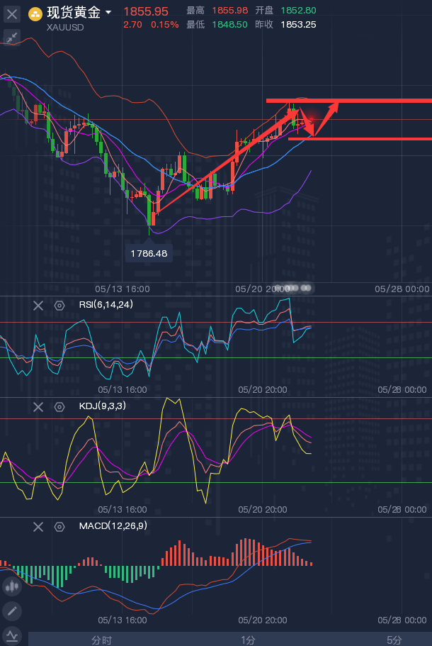 做投资,如果你的能力不足以支撑你现在的状况,那么需要一位军师助你操控大局,一次选择,就是一次转折!一次尝试,就是一次机会!最快的脚步不是跨越,而是继续,最慢的步伐不是缓慢,而是徘徊,最险的道路不是陡坡,而是陷阱,最好的行情不是单边,而是止盈!没有清醒的头脑,再快的脚步也会走歪;没有谨慎的步伐,再平的道路也会跌倒,迈开脚步,再长的路也不在话下,停滞不前,再短的路也难以到达。 ————————消息面 周三(5月25日)现货黄金震荡微跌,目前交投于1862.37美元/盎司,回吐了隔夜部分涨幅。周二因为美国新屋销售数据降至两年低位,欧洲央行行长拉加德强化7月加息预期,美元指数刷新近一个月低点,给金价