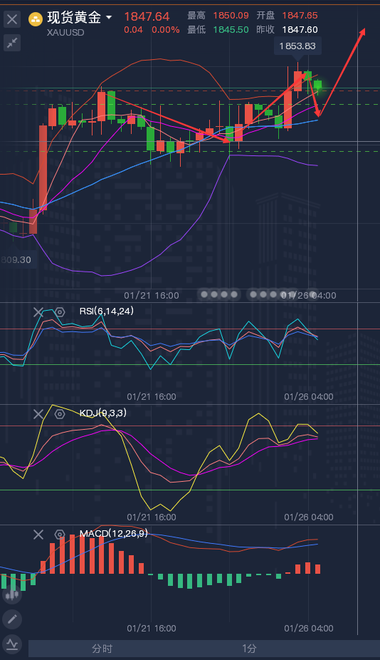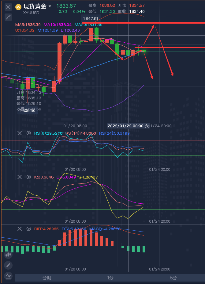 在我这里,我能做的是帮你合理的把控仓位,利用支撑和阻力位下单,让每一单有理可依,有迹可循。买卖点位不应该是随意进场,请对自己的资金负责。文章的开头龚关铭想说,如果你对行情真的无法把握,可以前来找到龚关铭,多一个分析师对你来说没有任何损失,永远记住一句话,专业的人做专业的事,一切实战只为盈利,合作只为双赢。 ——————消息面 周二(1月25日)亚洲时段,现货黄金持稳于1843附近。周一(1月24日)金价小幅上涨,围绕乌克兰问题的地缘政治紧张局势增强了黄金的避险吸引力,不过美股低位大幅反弹及美元走强限制了金价的涨幅。 原油窄幅震荡,油价周一下跌,投资者担心美联储可能比预期更快加息,导致股市等风
