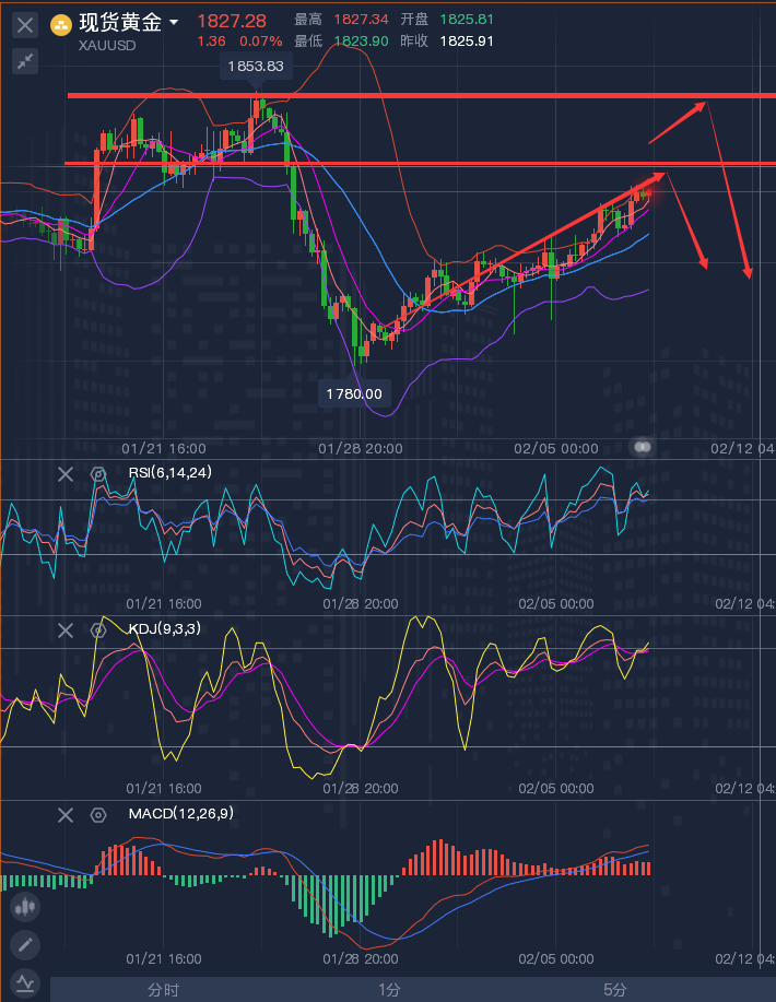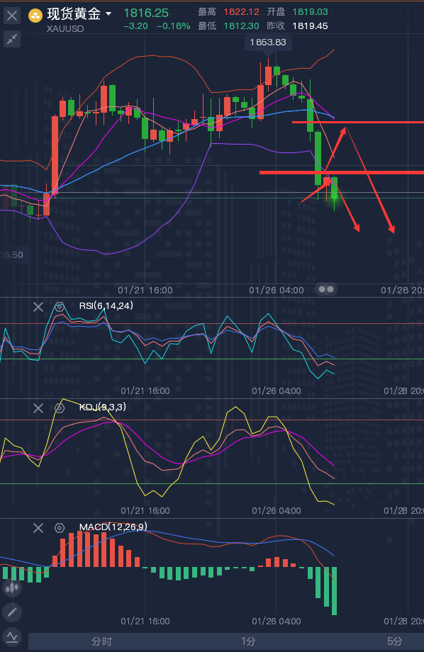 追涨杀跌的人,永远是靠运气赚小钱,靠实力****大钱! ——————消息面 周四(1月27日)亚洲时段,现货黄金交投于1820附近。周三(1月26日)金价大幅下挫,创一周新低,美元和美债收益率大幅反弹,之前美联储主席鲍威尔暗示美联储将在3月加息,在首次加息开始后还将收缩资产负债表。不过乌克兰危机仍然有望限制金价的跌势。 油价周三上涨,美油触及2014年10月以来最高至87.95美元/桶,布油七年来首次触及90美元/桶,因供应紧张以及俄罗斯和乌克兰之间不断恶化的政治紧张局势加剧了对本已吃紧的市场可能进一步受扰的担忧。 日内重点关注美国四季度GDP数据,另外,初请、耐用品订单以及四季度核心PCE