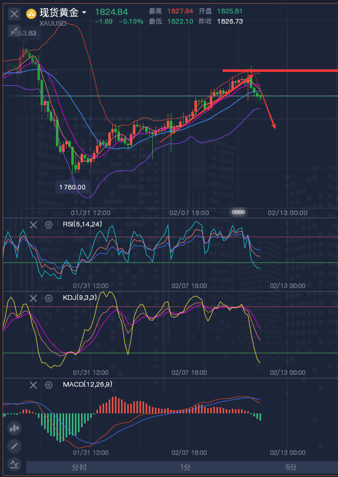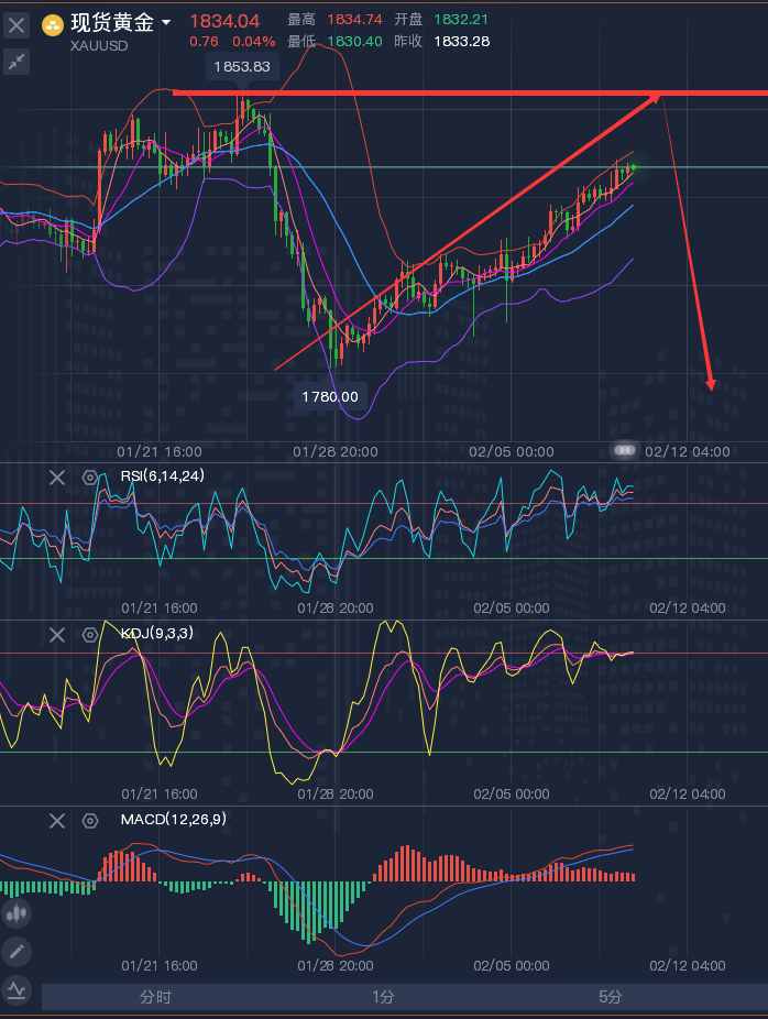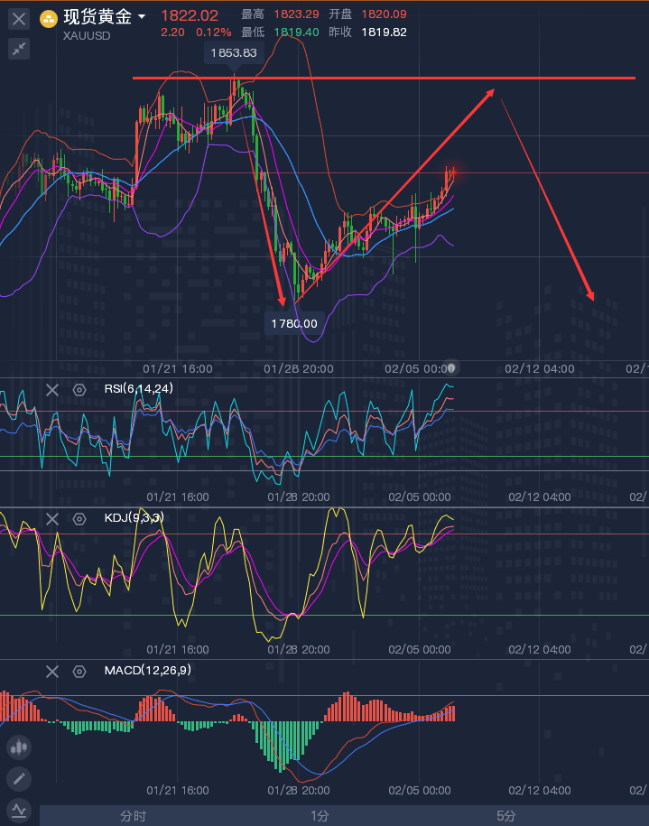 正月初七各行各业开工大吉,龚关铭团队依旧奋战在一线,不忘初心,再创辉煌,新年新气象,财源滚滚来。 ————————消息面 周一(2月7日)亚洲时段,现货黄金小幅上涨,交投于1812附近。上周五(2月4日)金价探底回升后小幅收涨,对通胀的担忧日益加剧,帮助缓冲了美元走强和美债收益率上升带来的压力,此前美国公布意外乐观的就业数据。另外,乌克兰危机继续为金价提供支撑。本周重点关注美国1月CPI。 原油小幅回落,油价上周表现强劲,上涨超5%,最高至七年新高93.17美元/桶,周线连续第七周上涨,因美国1月非农数据好于预期,且人们仍担心美国寒冷的天气和全球主要产油国持续的政治动荡导致供应中断;本周关注