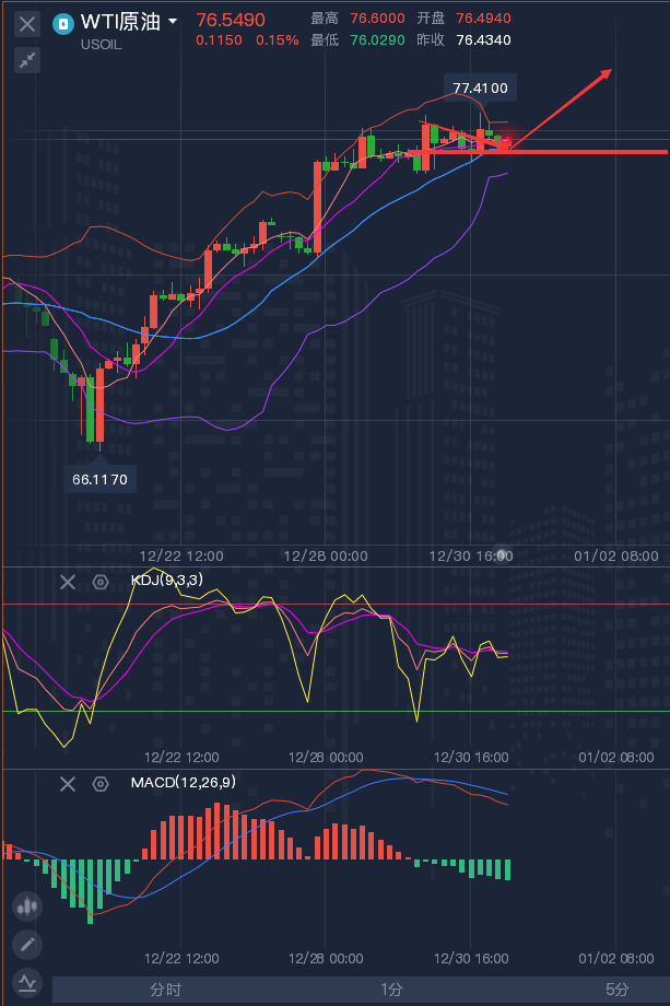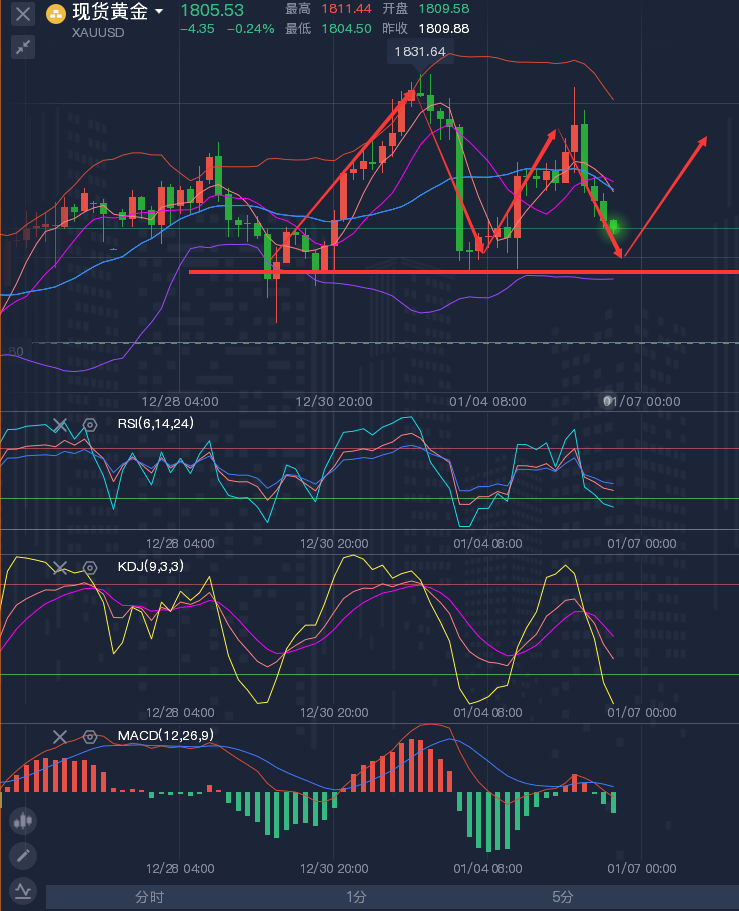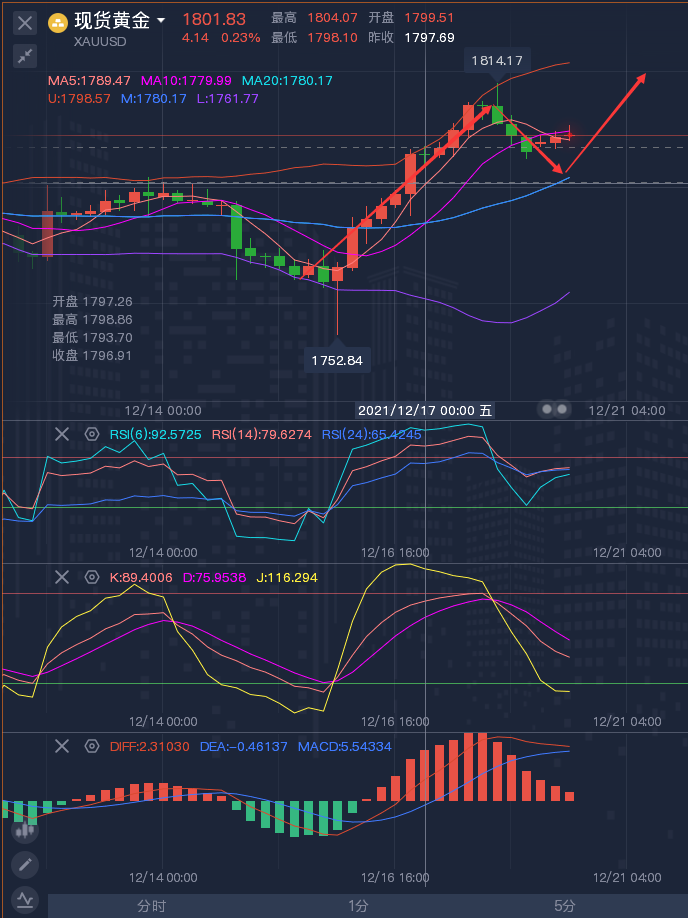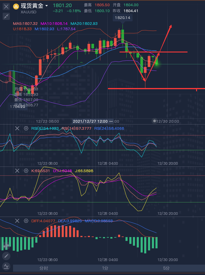 12月30日讯——周三(12月29日)美元指数下跌,年末市场交投淡静的,除日元外,所有G-10货币兑美元均上涨,英镑兑美元升至11月19日以来的最高水平。受美元走低提振,现货黄金跌破1790关口后大幅反弹,尾盘收于1805美元附近。油价继续走高,美油一度大涨1.83%,刷新11月26日以来高点至77.37美元/桶;布油盘中触及80美元关口,数据显示,上周美国原油和成品油库存均下降,盖过了对新病例增加可能拉低需求的担忧。 ——————黄金走势分析及策略 昨日黄金触及日线中轨后探底回升,充分说明此位置支撑强劲,多头仍强劲,但是附图指标开始走弱,不排除有下跌风险,今日仍然重