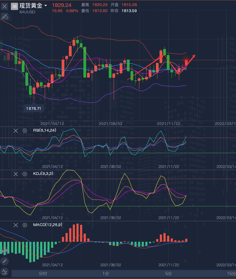投资市场并不会简单的朝着预期的方向进行,通往成功的路都是曲折的,而一旦走反,则将会失去方向,进入了循环,行情也同样如此,趋势是一定的,但是绝对不会简单地朝着预定方向一直走,期间会出来曲折而动摇人的内心,这时候就需要好的心态来面对,不受短线的走势所影响,这就是前期我们一直坚定布局波段,都是成功获利的原因,守得初心,方得始终,投资市场需要定力,需要持之以恒的决心,然后再去收获利润! ——————消息面 黄金小幅上涨,交投于1800上方。上周五金价冲高回落收跌,一方面奥密克戎病毒蔓延给金价提供支撑,另一方面,美元走强以及美联储官员的鹰派讲话令金价回吐涨幅。本周重点关注美国1