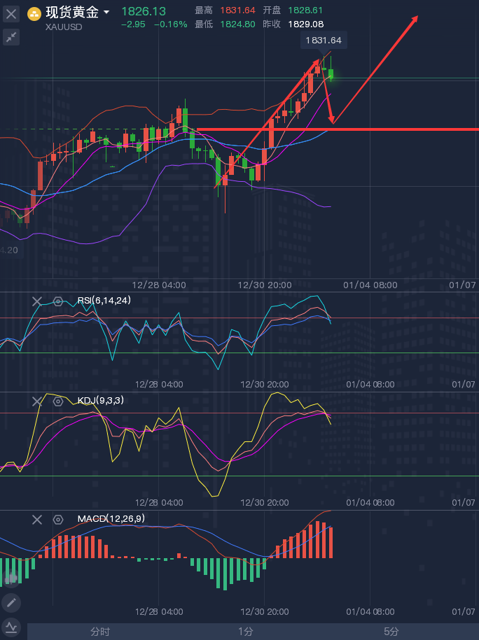 1月3日讯——2022年1月3日-1月9日当周市场的目光将主要聚焦在三件大事上,首先,周二OPEC+将举行24届OPEC和非OPEC产油国部长级会议。其次,美联储将公布上月货币政策会议纪要,同时,多名官员将公开发表讲话。最后,美国12月季调后非农就业人口数据将于周五公布,市场预估本次非农就业人数将新增40万人,前值为21万人。 ——————黄金走势分析及策略 黄金日线两连阳后,各项指标多头排列,短线仍有上升势头和动能,本周思路基本以日线中轨1800附近看涨为主,日内思路就很明确了,就看在什么位置做多,下方关注5日线1815附近支撑,四小时级别金价沿MA5上行,高位勿追