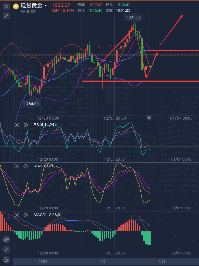 1月4日讯——新年第一个交易日,美元指数周一(1月3日)大涨0.57%,至96.21,与美国国债收益率同步,因投资者预计美联储将在2022年加息,美元指数盘中一度上涨0.6%,为11月10日以来最大盘中涨幅。投资者对奥密克戎新冠病毒变种影响的担忧置若罔闻,在特斯拉和银行股上涨的帮助下,标普500指数和道琼斯工业指数周一再创创下收盘纪录高点。现货黄金大跌1.5%,收报每盎司1801.45美元,创逾一个月来最大单日百分比跌幅。油价则小幅收高,因投资者对2022年需求进一步复苏抱有希望。 ——————黄金走势分析及策略 黄金昨日日线收大阴,但目前仍运行于日线中轨上方,关键点