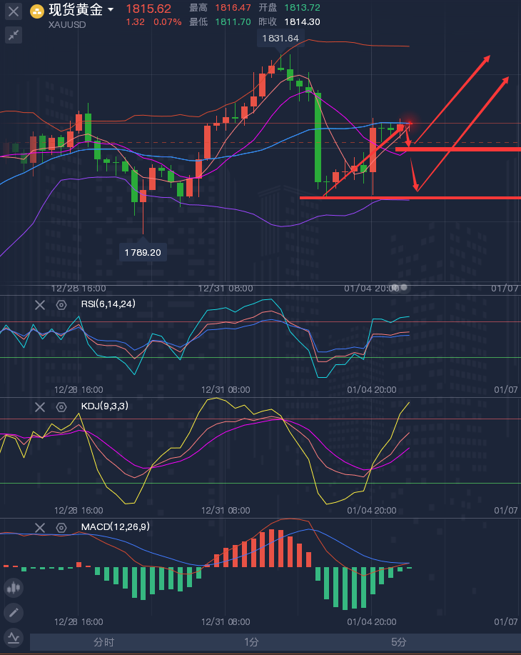 1月5日讯——1月4日美元小幅上涨,市场预期美联储今年将升息而导致美债收益率上升支撑了美元,日元保持在近四年低点。金价走高,现货黄金收于1815美元附近,市场担心Omicron变种病例激增可能威胁到全球经济复苏,提振了黄金的避险需求。布油创去年11月25日以来新高至80.55美元/桶,此前OPEC+维持2月小幅增产计划,龚关铭认为,全球石油需求承受住了疫情冲击,供应料比之前预期更为紧张 ——————黄金走势分析及策略 昨日大阳反弹,收复周一部分跌势,从日线结构上来看,在触及中轨附近受到支撑再次反弹,短线价格有望再次去试探1830一线,甚至更高,四小时来看,布林带走平,