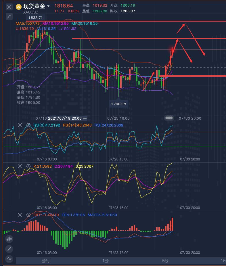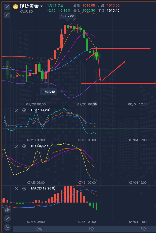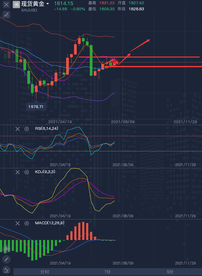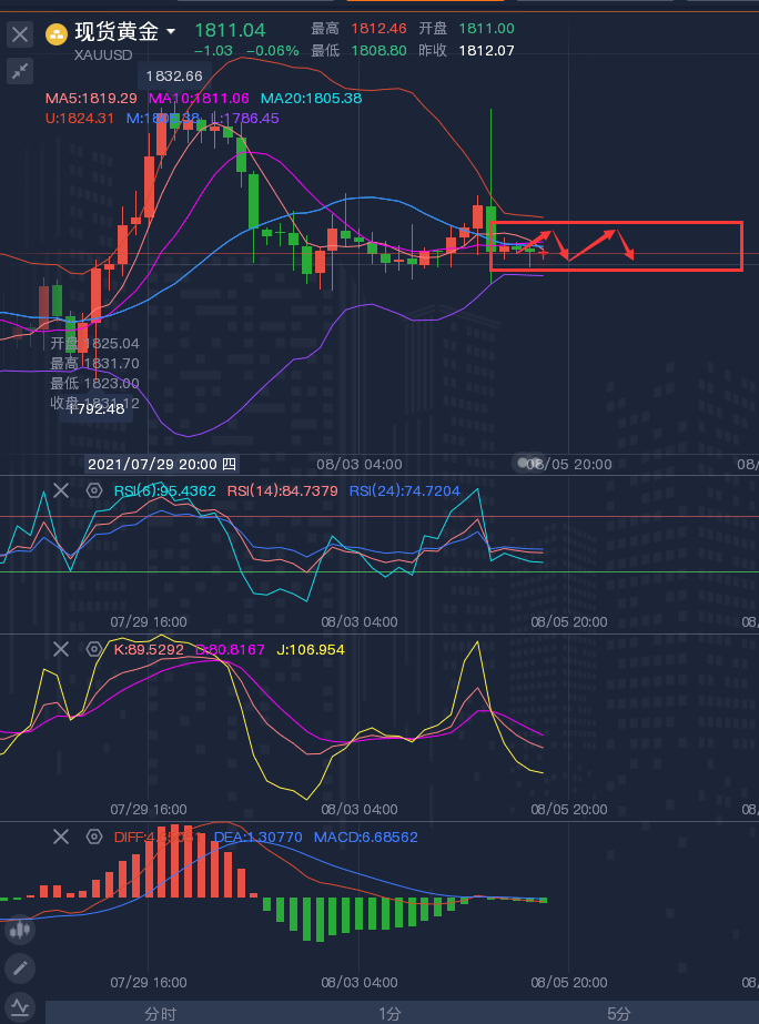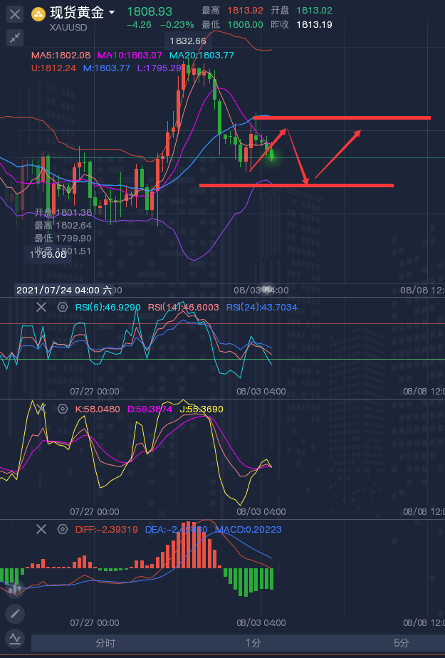 龚老师这里没有华丽的语言,只有实实在在的交易,以及明明郎朗的操作,市场只有一个方向,不是多头也不是空头,而是做对的方向。合理的风控+好的投资回报,让每个散户找到真正投资的乐趣,而不再是自己每天苦苦的交易却换来亏损的不断加大。 ——————消息面 (8月4日)现货黄金持稳于1810附近,周二(8月3日)金价小幅下跌,美国数据显示制造业保持强劲,但是美联储官员们讲话偏鸽,另外投资者本周五,美国劳工部将公布非农就业人口数据,7月份的就业市场数据可能为美联储是否在年底前开始缩减月度债券购买规模、收紧货币政策提供一些方向。投资者在这一重磅数据出炉前表现得非常谨慎,金价本周陷入横