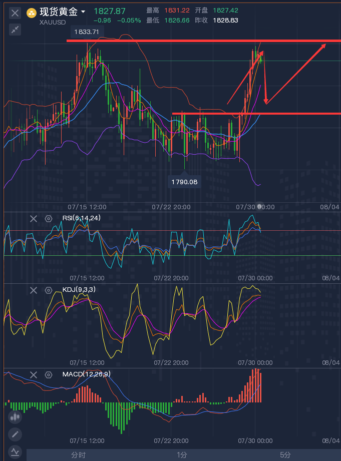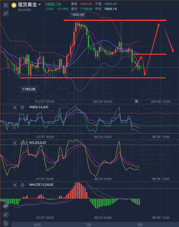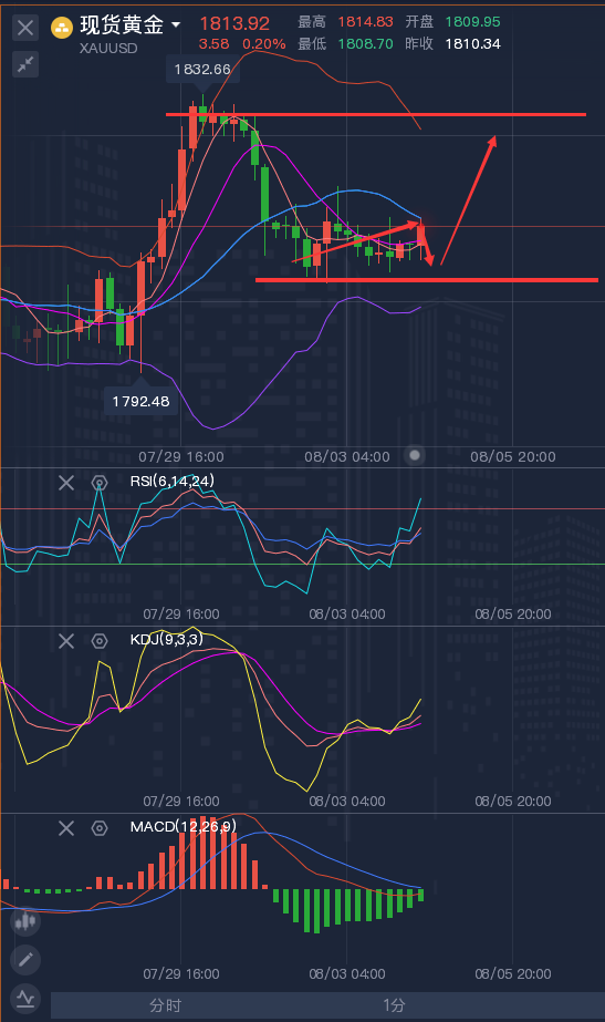 做投资,如果你的能力不足以支撑你现在的状况,那么需要一位军师助你操控大局,一次选择,就是一次转折!一次尝试,就是一次机会!最快的脚步不是跨越,而是继续,最慢的步伐不是缓慢,而是徘徊,最险的道路不是陡坡,而是陷阱,最好的行情不是单边,而是止盈!没有清醒的头脑,再快的脚步也会走歪;没有谨慎的步伐,再平的道路也会跌倒,迈开脚步,再长的路也不在话下,停滞不前,再短的路也难以到达。 ——————消息面 周四(8月5日),现货黄金持稳于1810附近。周三(8月4日)金价冲高回落,一方面,美国疲软的ADP就业支撑了金价,另一方面,因美联储高级官员的言论和创纪录的服务业活动数据,令市