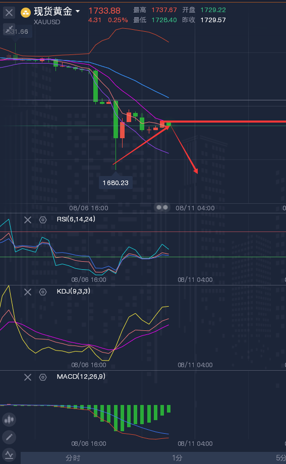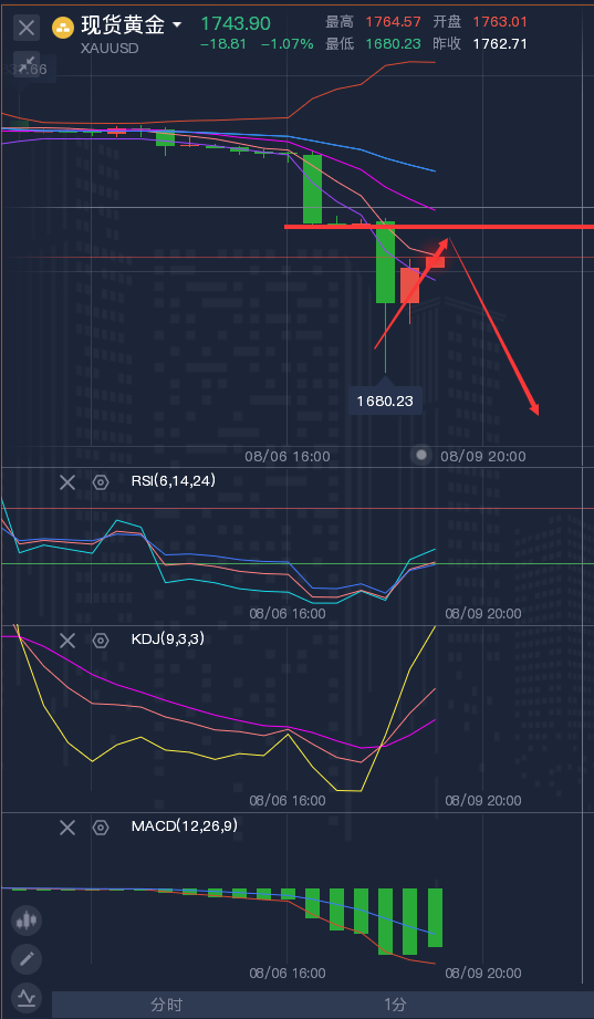 投资过程中关铭认为最重要的是风控和顺势布局,让本金在有效的保护下,再去获得利润,正确趋势中更能获得双重保护,以关铭的操作方式可以把风险控制到最小,从长远上来看却能获利更多利润,一两单收益多少并不能代表什么,长久稳定的收益才是我们要的,如果你一直在这个市场上赚不到钱,是否忽视了我所说的,那来找到我,关铭给你最需要最合适的投资方式,用盈利收益让你重获激情! ——————消息面 8月9日亚市盘初,现货黄金大幅跳水,直接失守1700关口,创4月1日以来新低至1609.03美元/盎司,跌幅约4%,在开盘不到一小时的时间里,累计跌幅超过70美元。一方面是上周五美国靓丽非农数据的影